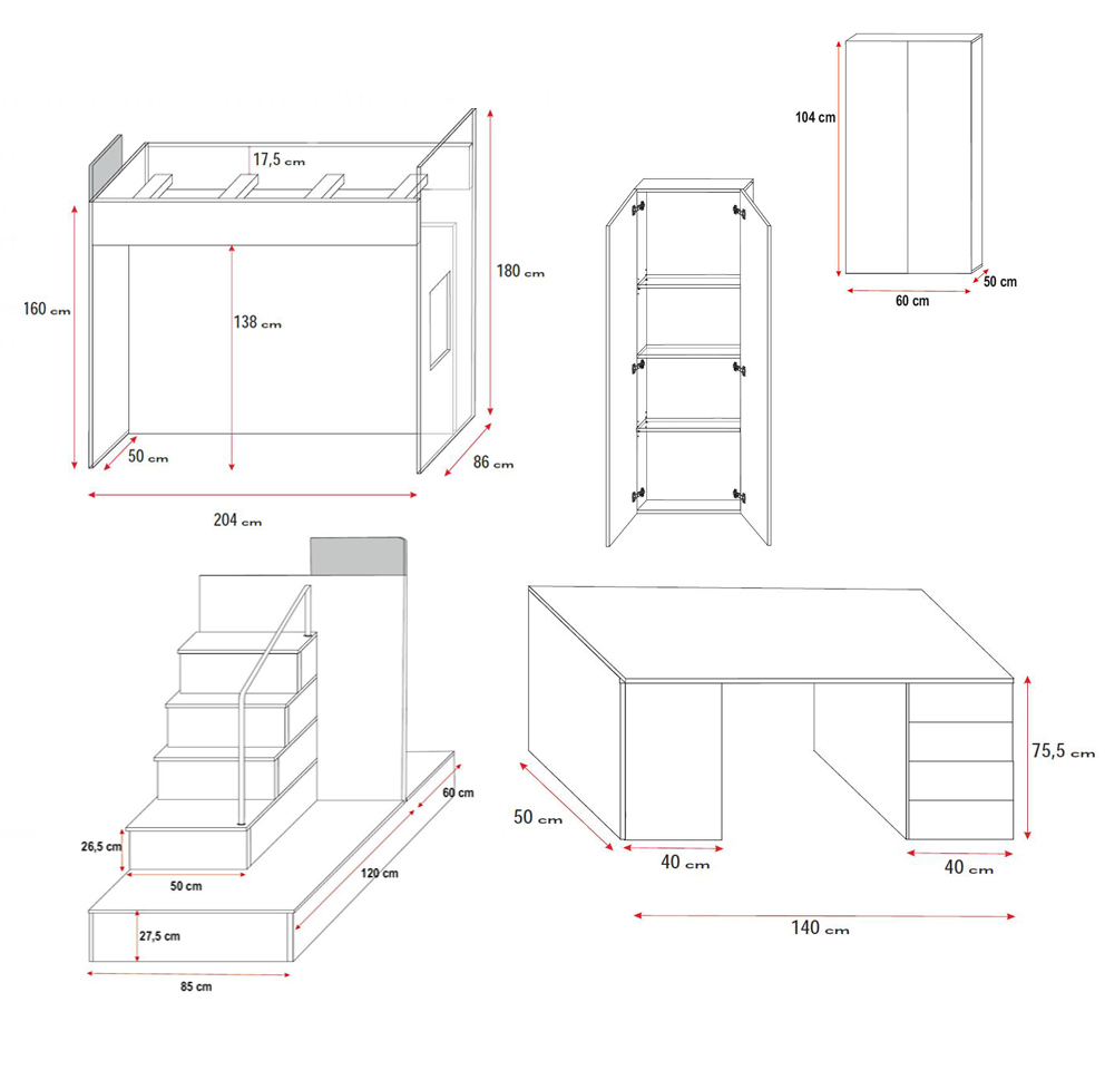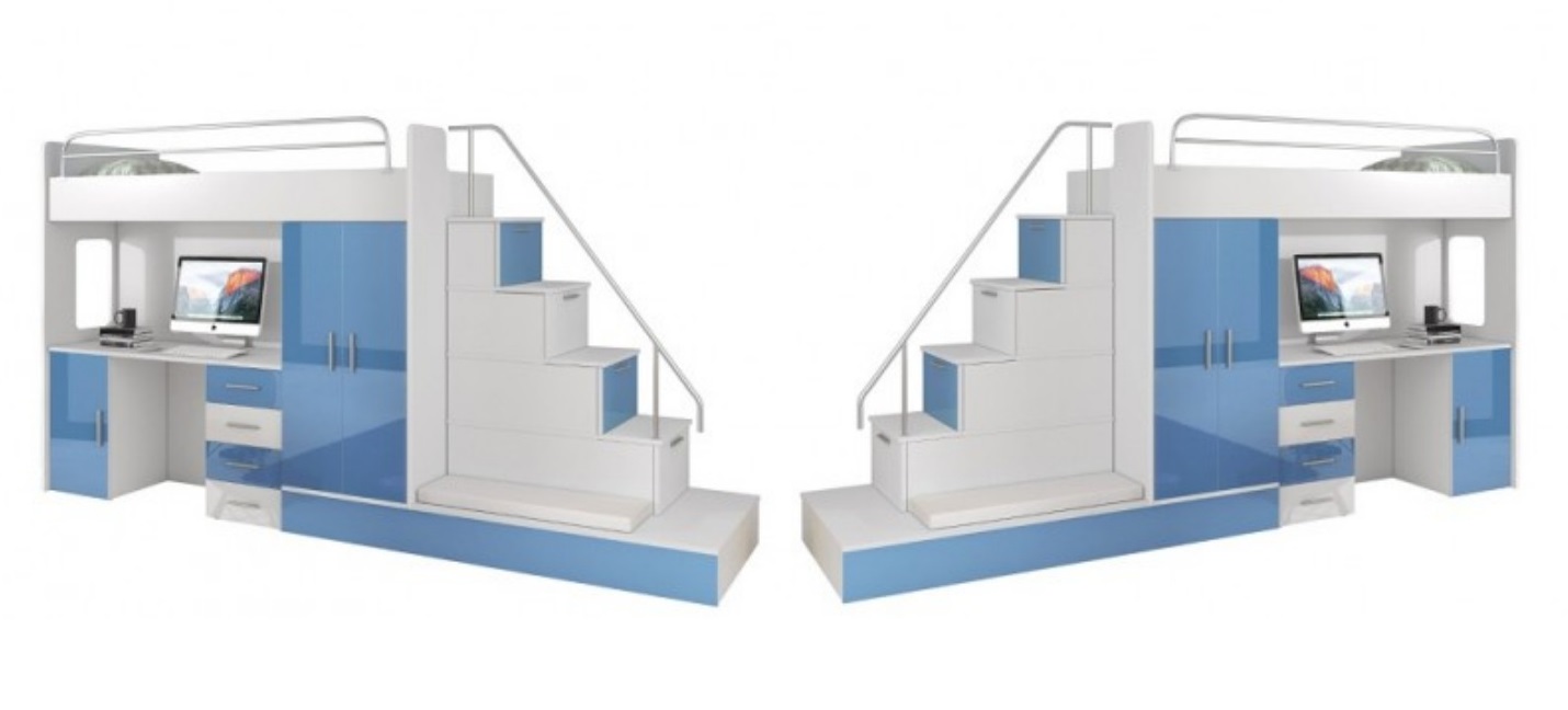 Papildus informācija: Šis augstais gultas ir ideāls variants viesnīcām, bērnu istabām vai jebkurai telpai, kur nepieciešama plaša un funkcionala gulta. Papildus augstā loža, komplektā ietilpst rakstāmgalds ar vienām durvīm un četrām atvilktnēm, drēbju skapis ar divām durvīm un kāpnes. Ar zilo dizainu, tas ir gan mūsdienīgs, gan stilīgs papildinājums jebkuram telpas interjeram. Izbaudi praktiskumu un eleganci ar šo augsto gultu!