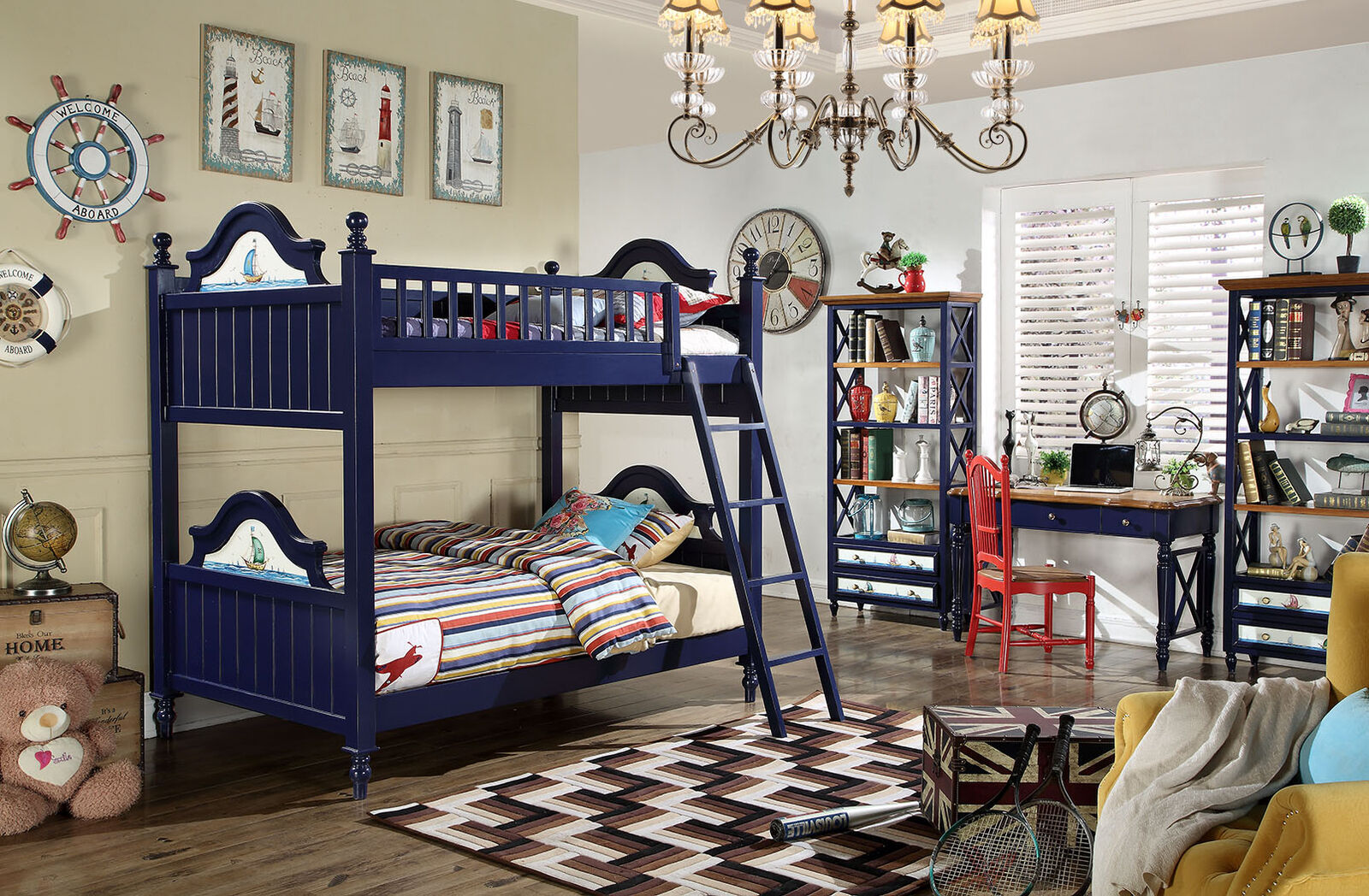 Klasiskais divstāvu bērnu gultas mēbeļu bērnu numuriem gulta augšējā stāvā.