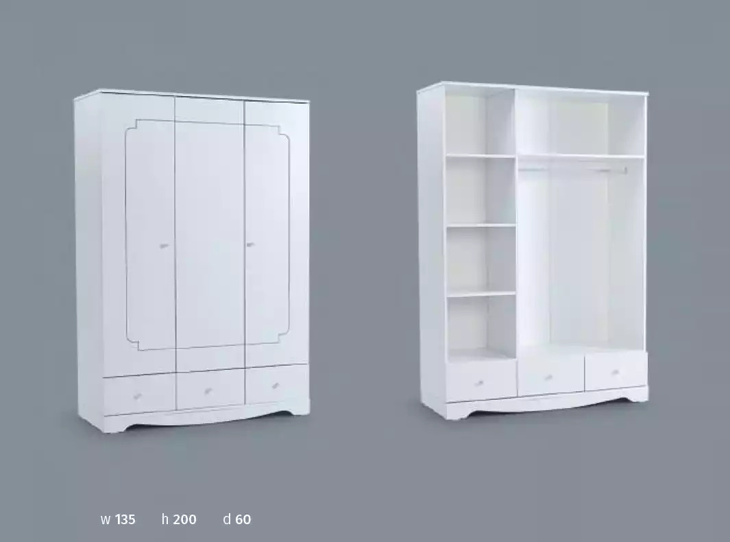 Šis komplekts iekļauj gan gultas tīklu, gan iekšējo dekorāciju, bez spilveniem, piedāvājot pilnvērtīgu un ērtu guļamvietu jūsu mazulim. Skapītis un komoda ar izmēriem apmēram 135 x 60 x 200 cm un 82 x 45 x 80 cm attiecīgi sniegs daudz vietas mantu un apģērbu glabāšanai. Krāsa atbilstoši attēlam nodrošina elegantu un mūsdienīgu izskatu jebkurā bērna istabā. Ar šo komplektu jūsu mazulim būs gan ērti guļt, gan pietiekami daudz vietas mantu glabāšanai.