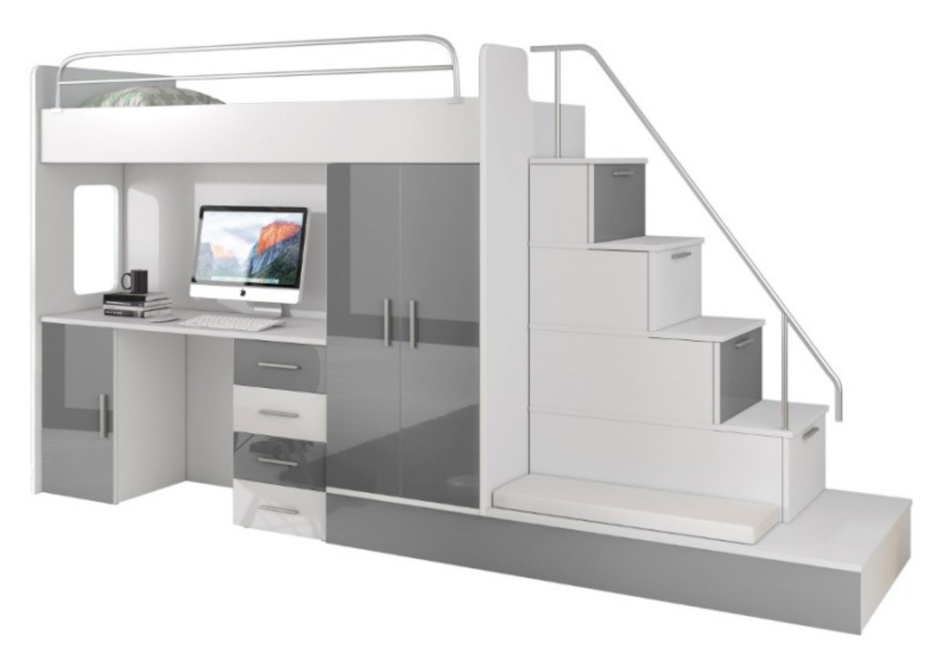 Otrajā stāvā var novietot matraci ar izmēru apmēram 80 x 200 cm, nodrošinot jūsu bērnam mīkstu un ērtu guļvietu. Rakstāmgalds ar vienām durvīm un četriem atvilktnēm ir lielisks papildinājums, nodrošinot lielisku darba un mācību vietu. Skapītis ar divām durvīm sniedz papildus uzglabāšanas iespējas, savukārt kāpnīte padara gultu viegli sasniedzamu un drošu. Ar greznu pelēku krāsu un labi izstrādātu dizainu, šī gulta būs ne tikai praktiska, bet arī burvīga interjera detaļa jūsu bērnu istabā.