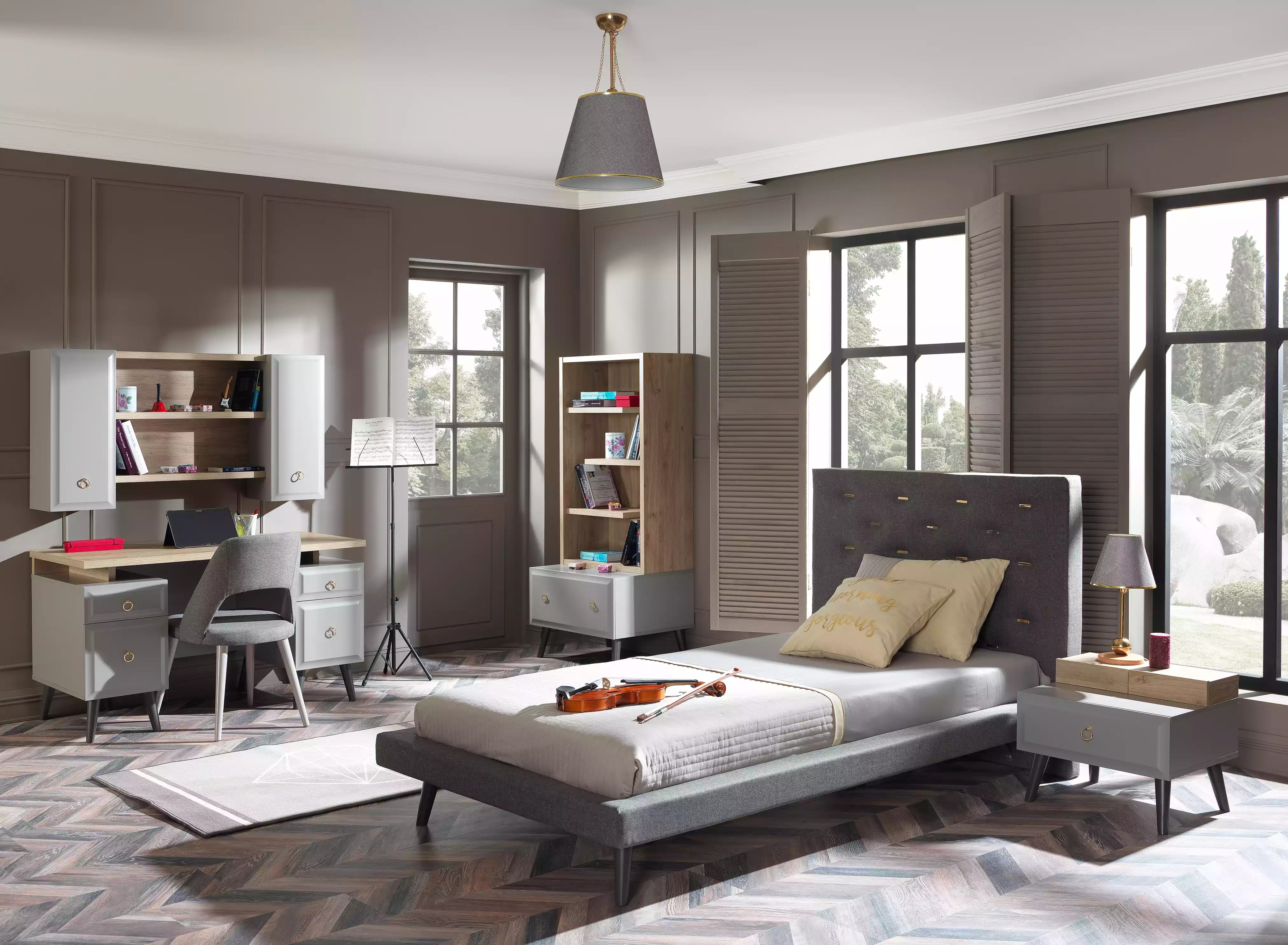 Izbaudi lielisku izvēli bērnu istabas iekārtošanai ar jauniešu gultu no šī komplekta 5 gabalos. Šis koka pelēkais komplekts būs lielisks papildinājums ikvienam bērnu istabai, nodrošinot gan komfortu, gan funkcionalitāti. Ar gultu, rakstāmgaldu, grāmatu plauktiem un naktsgaldiņu, šis komplekts piedāvā visu nepieciešamo, lai bērnu istaba būtu gan mājīga, gan praktiska.