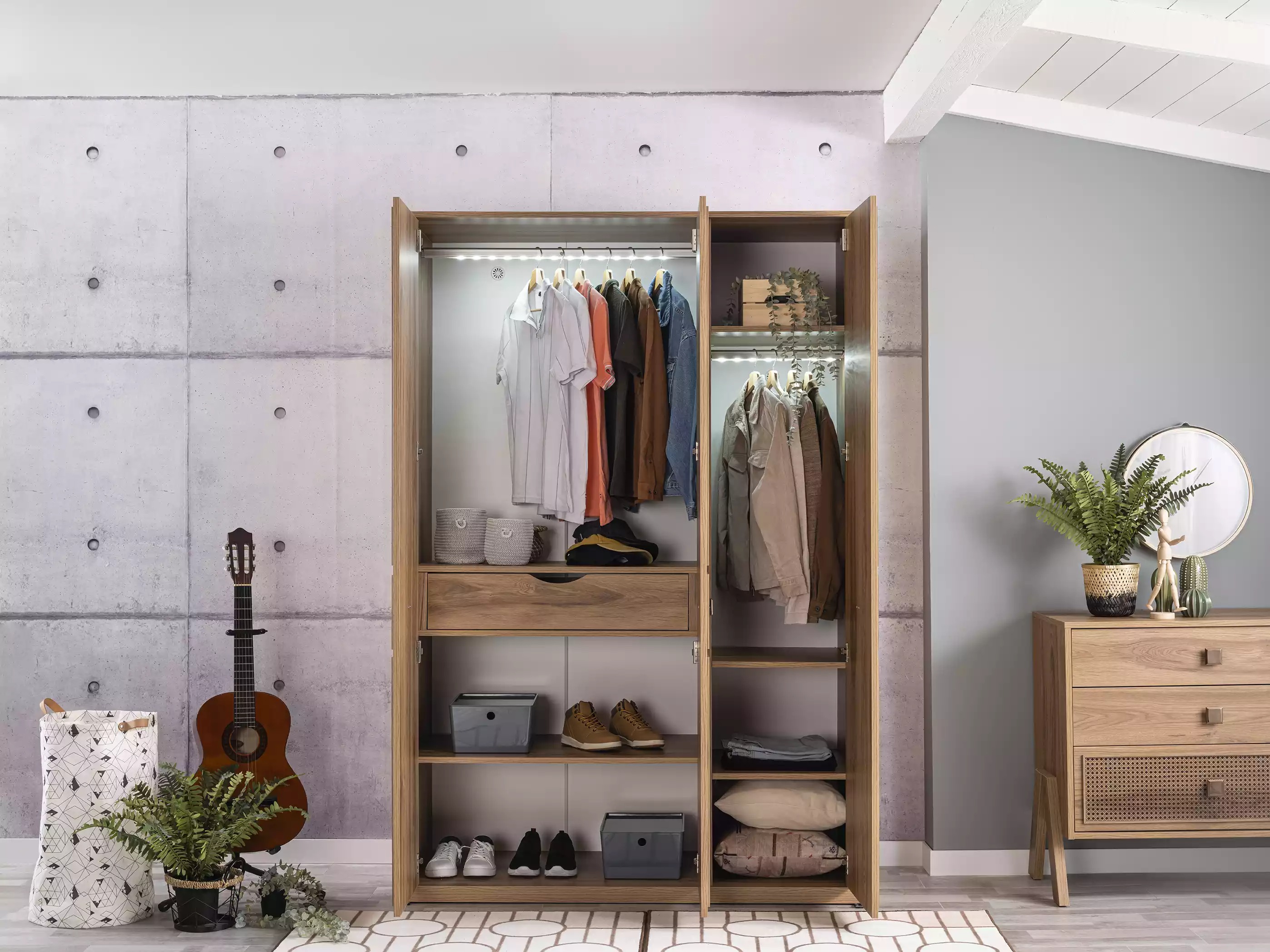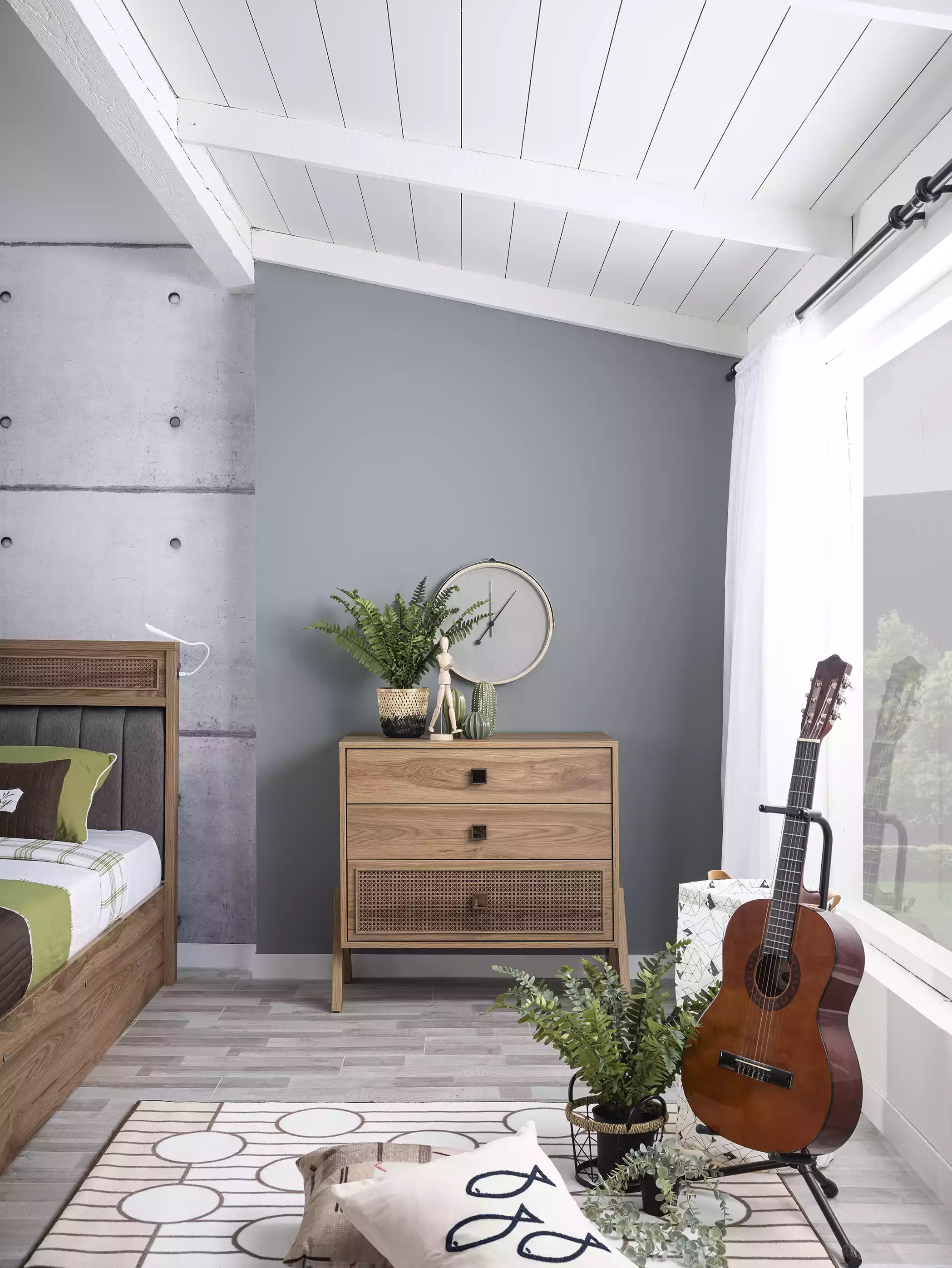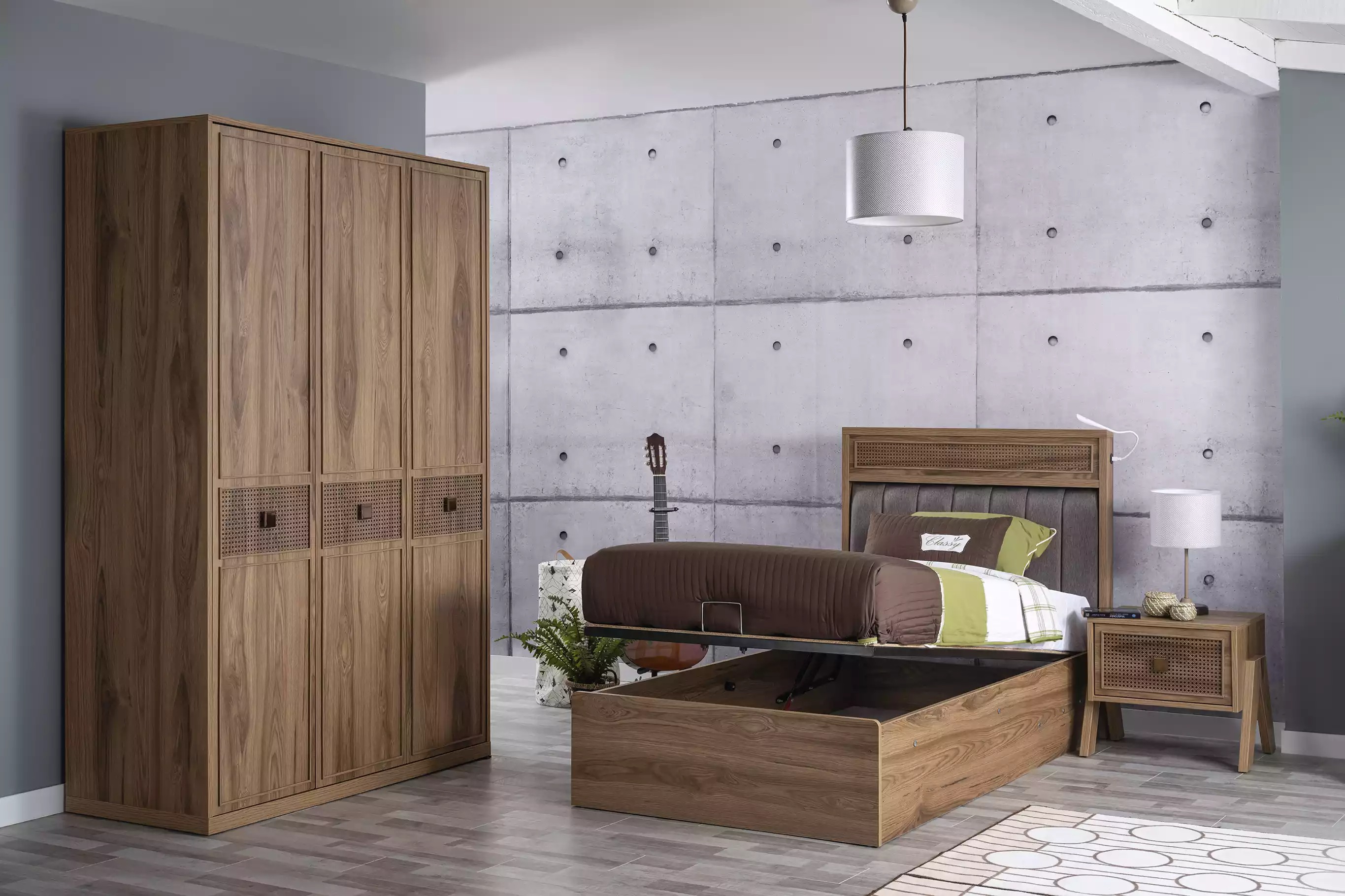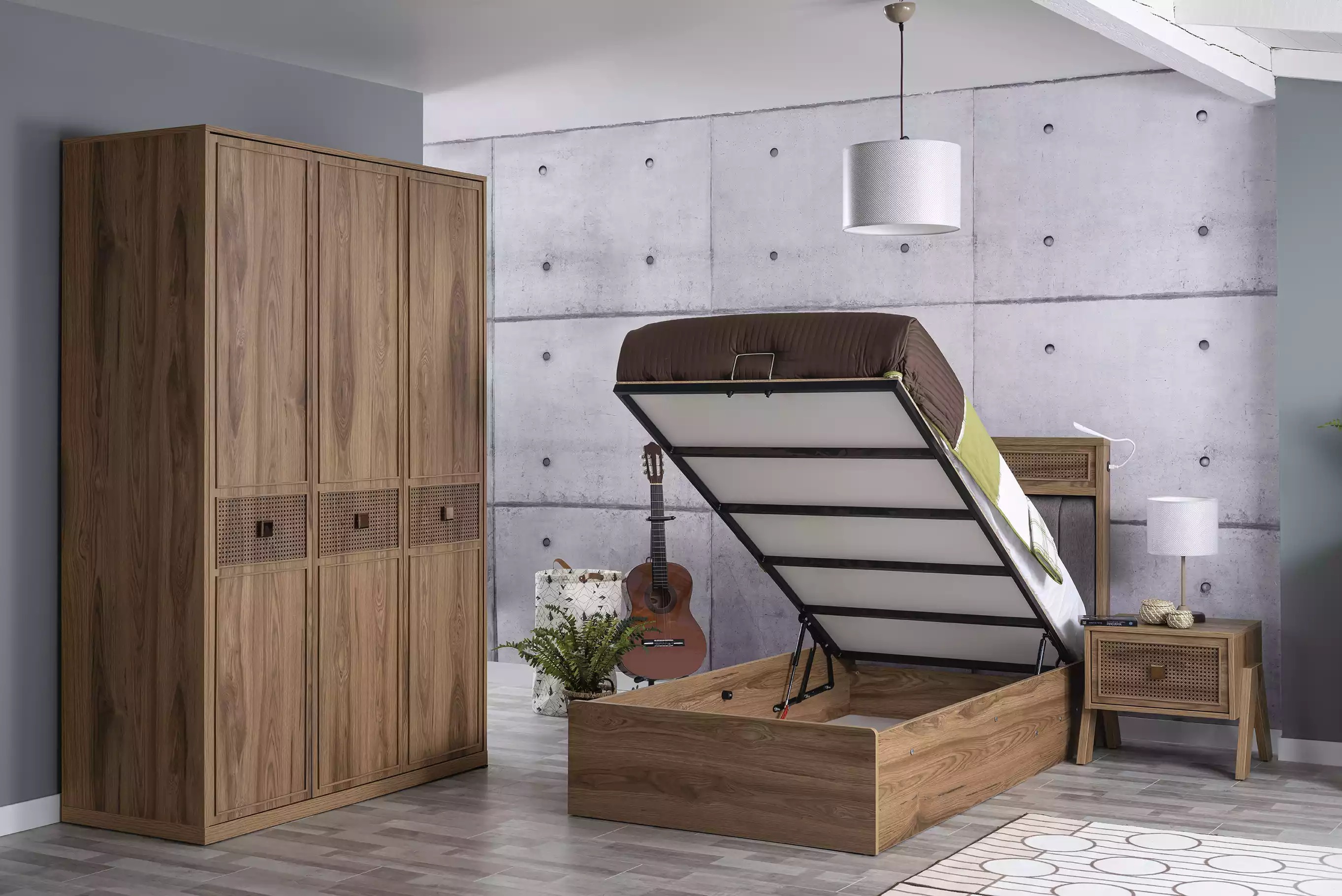 Šis komplekts ietver arī naktsgaldiņu, skapi un kumodi, komplektējot jauniešu guļamistabu ar nepieciešamajiem mēbeļu gabaliem pilnvērtīgu dzīvei un atpūtai. Produkta krāsa ir kā attēlā, tā garantējot savstarpēju saskanību ar citām guļamistabas mēbelēm. Šis komplekts ir lielisks risinājums, nodrošinot vienlaicīgi gan funkcionalitāti, gan eleganci jauniešu guļamistabā.