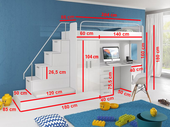 Jauniešu istabas gulta divstāvu gultas divvietīgā gulta rakstāmgalds skapis RAJ 5S piedāvā modernu un funkcionālu dizainu, kas ideāli iederēsies jauniešu istabā. Šī divguļamā gulta ar divstāvu gultu un pievienoto rakstāmgaldu un skapi ir pilnīga risinājuma, lai optimizētu telpas izmantošanu. Izgatavota no izturīga koka, tā ir ne tikai skaista, bet arī ilgdzīvotspējīga un stabila. Ar kopējo platību apmēram 324 cm x 86 cm x 180 cm, šī gulta nodrošina komfortablu guļamvietu un pievienoto darba un glabāšanas vietu vienā.