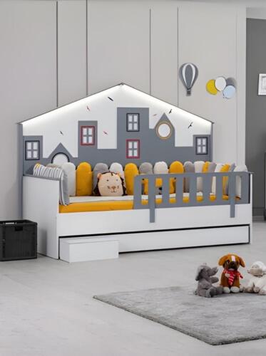 Pateicoties guļamajai platībai 1 90 x 190 cm un guļamajai platībai 2 80 x 180 cm, šis gultas karkass ir ērti pielāgojams bērnu dažādajiem vecumiem un vajadzībām. Augstums apmēram 150 cm un platums apmēram 100 cm nodrošina pietiekamu telpu bērniem gulēšanai un atpūtai. Gultas karkass ir gan praktisks, gan stilīgs, lielisks papildinājums jebkurai bērnu istabai, nodrošinot drošu un komfortablu guļamvietu.