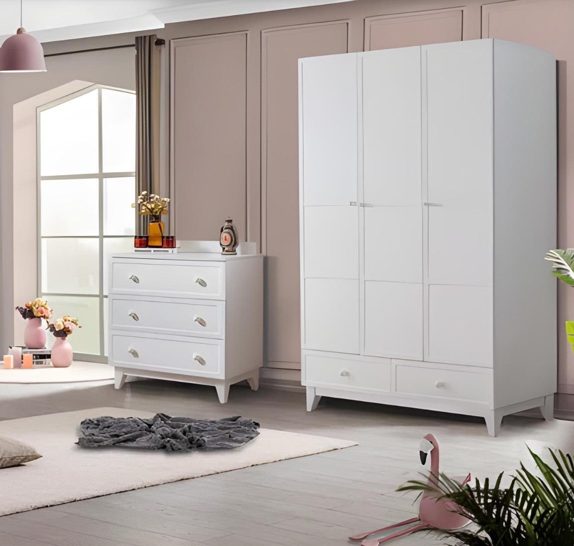 Šis komplekts ir izgatavots no augstas kvalitātes kokmateriāla, kas nodrošina ilgmūžību un izturību. Ar moderno dizainu un baltā krāsā, šis komplekts būs lielisks papildinājums mūsdienīgai bērna istabai. Neatkarīgi vai izvēlaties to izmantot bērna apģērbu un citu mantu glabāšanai, vai arī vienkārši kā dekoratīvu elementu, šis greznais komplekts piedāvā daudzpusīgas iespējas pielāgot savam bērna istabas dizainam un vajadzībām.