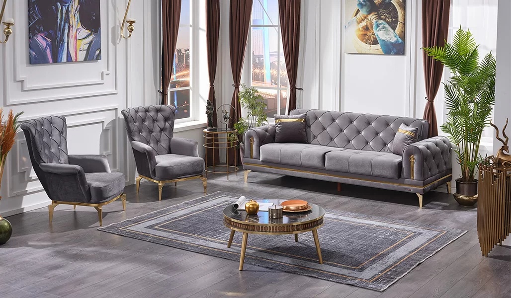 Izsmalcināts trīs daļu dizaina dīvānu komplekts, kurā ietilpst divi Česterfīlda krēsli un plašs 3 sēdvietu dīvāns, ir ideāls risinājums, lai radītu elegantu atmosfēru jūsu mājās. Izgatavots no augstas kvalitātes pelēka poliestera, šis komplekts apvieno komfortu un estētiku, kas atspoguļo izsmalcinātu dzīvesstilu. Katrs elements ir rūpīgi izstrādāts, lai nodrošinātu ne tikai vizuālu baudījumu, bet arī ilgmūžību un funkcionālitāti. Ar 20 gadu pieredzi luksusa mēbeļu ražošanā, mūsu zīmols piedāvā plašu premium dizainu klāstu, kas radīs ekskluzīvu un iedvesmojošu mājas vidi. Šis dīvānu komplekts ir ne tikai mēbele, bet arī mākslas darbs, kas paaugstina jūsu telpu uz jauniem standartiem.