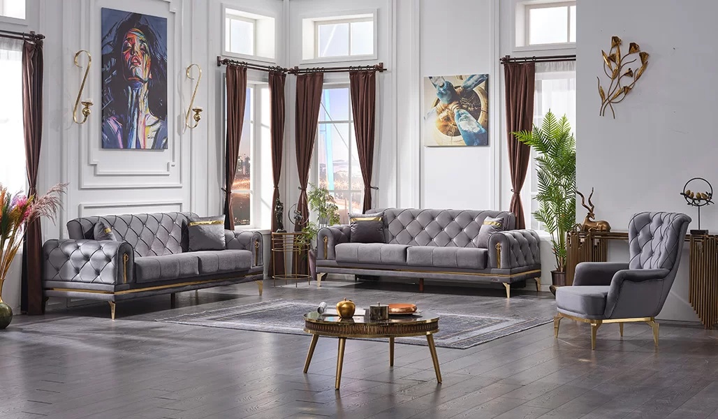 Česterfīlda komplekts 3+3+1 vietas ir izsmalcināts luksusa salons, kas apvieno eleganci un komfortu. Izgatavots no augstvērtīga pelēka poliestera, tas papildina jūsu interjeru ar mūsdienīgu šarmu un izsmalcinātību. Šis komplekts ir radīts, lai atbilstu prasīgākajām gaumēm, nodrošinot ne tikai estētiku, bet arī ilgmūžību. Ar savu izsmalcināto dizainu un izcilajām apdarei, Česterfīlda salons kļūs par centrālo elementu jūsu mājās, kur apvienojas stils un funkcionalitāte. 20 gadu pieredze luksusa mēbeļu ražošanā garantē, ka šis komplekts ir ideāls izvēle tiem, kas vēlas izcelt savu ekskluzīvo dzīvesveidu.