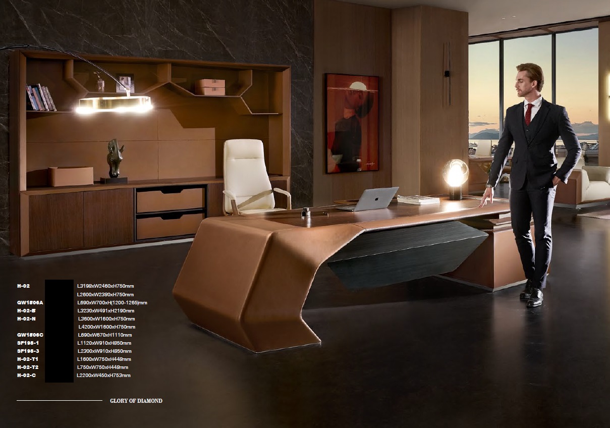 Dizainera biroja darba istaba komplekts komplekts nodalījums galds skapis mēbeles ir elegants un funkcionāls komplekts mēbeļu, kas nodrošina stilīgu un efektīvu darba vidi. Stūra rakstāmgalds ar izmēriem apmēram 260x230 cm ir lielisks darba telpas centrpunkts, nodrošinot pietiekami daudz vietas darba dokumentiem un tehniskajiem ierīcēm. Krēsls ar regulējamu augstumu un platuma lielumu nodrošina ergonomisku un komfortablu sēdēšanas pieredzi, kamēr skapis ar izmēriem apmēram 323x219x49.1 cm nodrošina lielisku glabāšanas sistēmu darba piederumiem un dokumentiem.