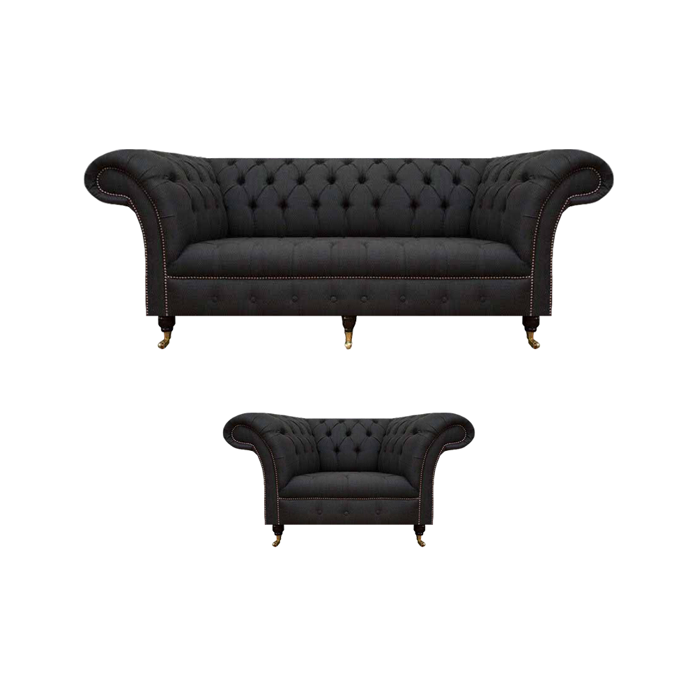 Chesterfield melnas auduma komplekts dizainera 3-vietīgais dīvāns un krēsls: