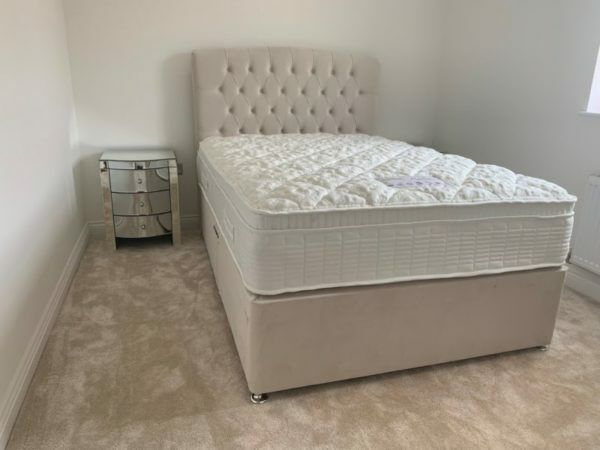 Liels gaiši bežs česterfīlda divguļamā gulta, luksusa modernas gultas.