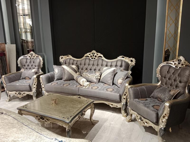 Mākslinieciskais viesistabas komplekts Dīvāngarnitūras komplekts Dīvāngarnitūra 3+3+1+1 ir elegants un stilīgs komplekts, kas iekārtojis viesistabu ideāli. Šis komplekts ietver 2 dīvānus un 2 krēslus, kas nodrošina ērtības un komfortu jūsu viesiem. Katrs mēbeļu gabals ir izgatavots no augstas kvalitātes koka ar tekstila polsterējumu, nodrošinot gan izturību, gan patīkamu sēdēšanas pieredzi.