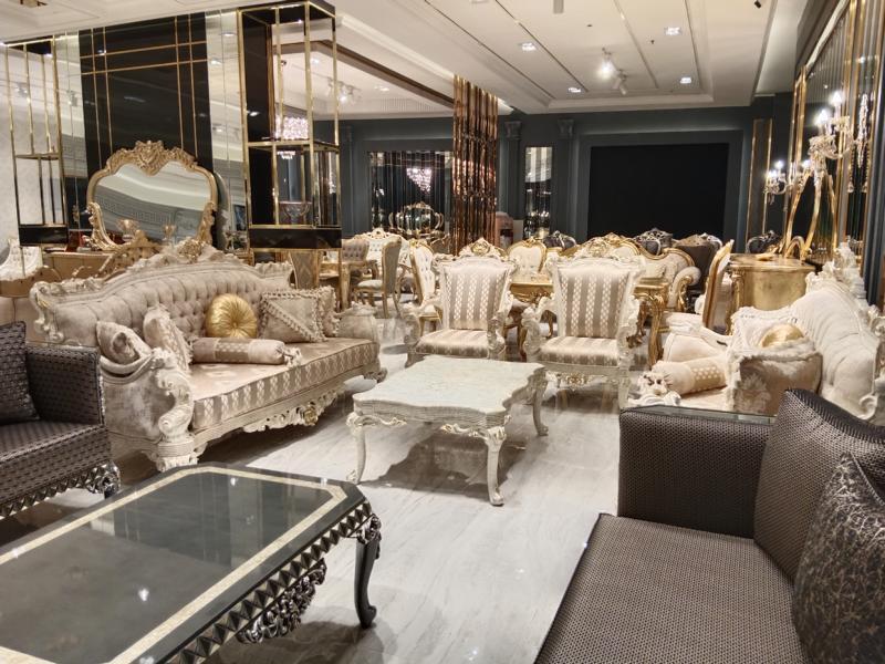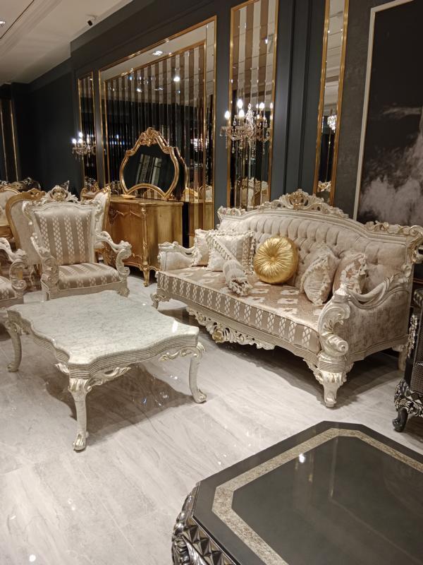 Izklaidējošs dzīvojamais istabas mīkstās mēbeles komplekts ar augstvērtīgiem dīvāniem un elegantām krēslām.