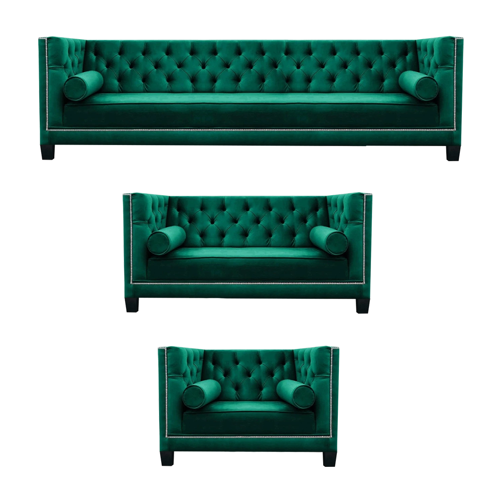 Šis Sofagarnitūra Chesterfield Jauna Kompleta Mēbeļu komplekts ir īsta dāvana jūsu mājai, piedāvājot gan stilīgu dizainu, gan ērtību. Komplektā ietilpst 4-vietīgs dīvāns, 2-vietīgs dīvāns un krēsls, kas izgatavoti no koka ar tekstila apdari. Ar signāla zaļu krāsu un Premium mākslīgo ādu, šī sofagarnitūra piešķirs jūsu telpai ekskluzīvu un mājīgu atmosfēru. Kristāla akmeņiem pie pogām dodot iespēju izvēlēties papildu dizaina elementu.