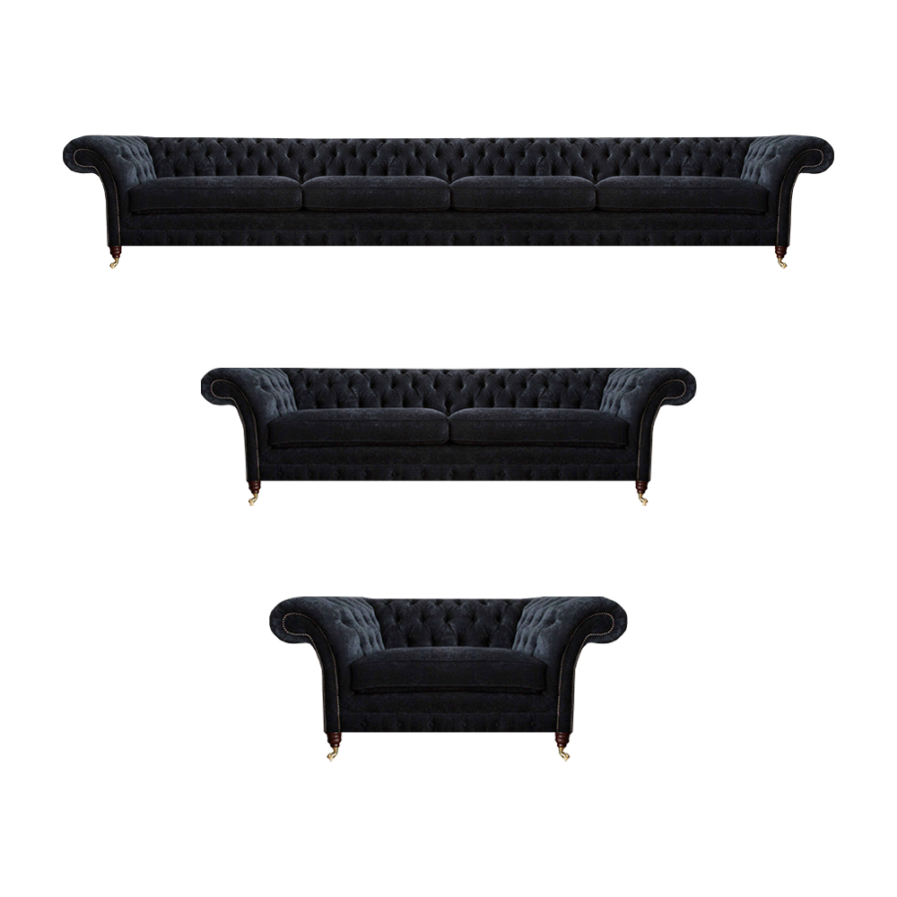Chesterfield Melnganā tekstila komplekts ar četrām sēdvietām, divvietīgu dīvānu un krēslu.