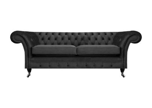 Luksusa melna divvietīga dīvāns no tekstila, Chesterfield stilā, dzīvojamā istaba.