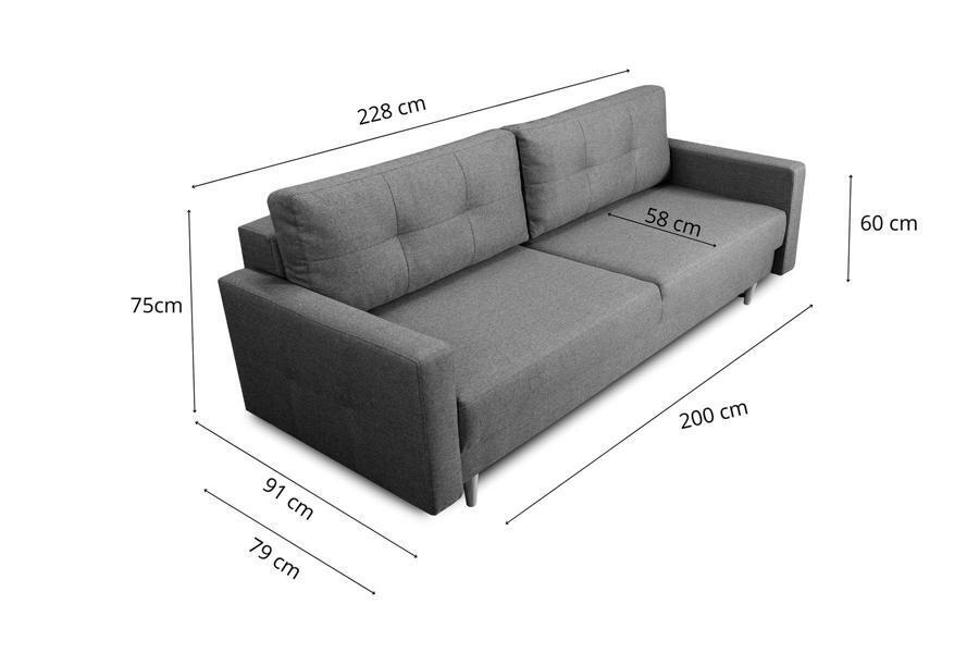Stil, stingrums un komforts ir galvenās priekšrocības šī ērta un praktiskā izvelkamā 3-vietīgā dīvāna. Ar izmēriem 228 x 91 x 75 cm, tas nodrošina lielisku sēdēšanas pieredzi gan individuāli, gan kopā ar ģimeni vai draugiem. Dīvāns ir izgatavots no augstas kvalitātes materiāliem - koka un auduma, nodrošinot ilgstošu izturību un eleganci telpā. Sēdēšanas augstums 44 cm un sēdēšanas dziļums 58 cm garantē komfortu un ergonomisku atpūtu, savukārt krāsa kā attēlā vai citas pēc pieprasījuma dod iespēju izvēlēties atbilstoši sava interjera stilam.