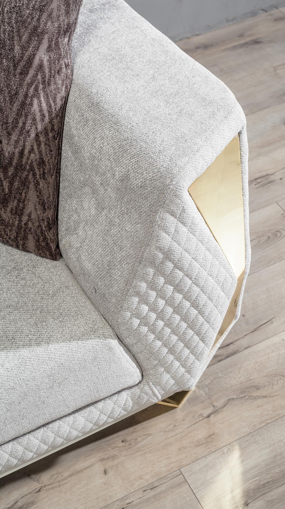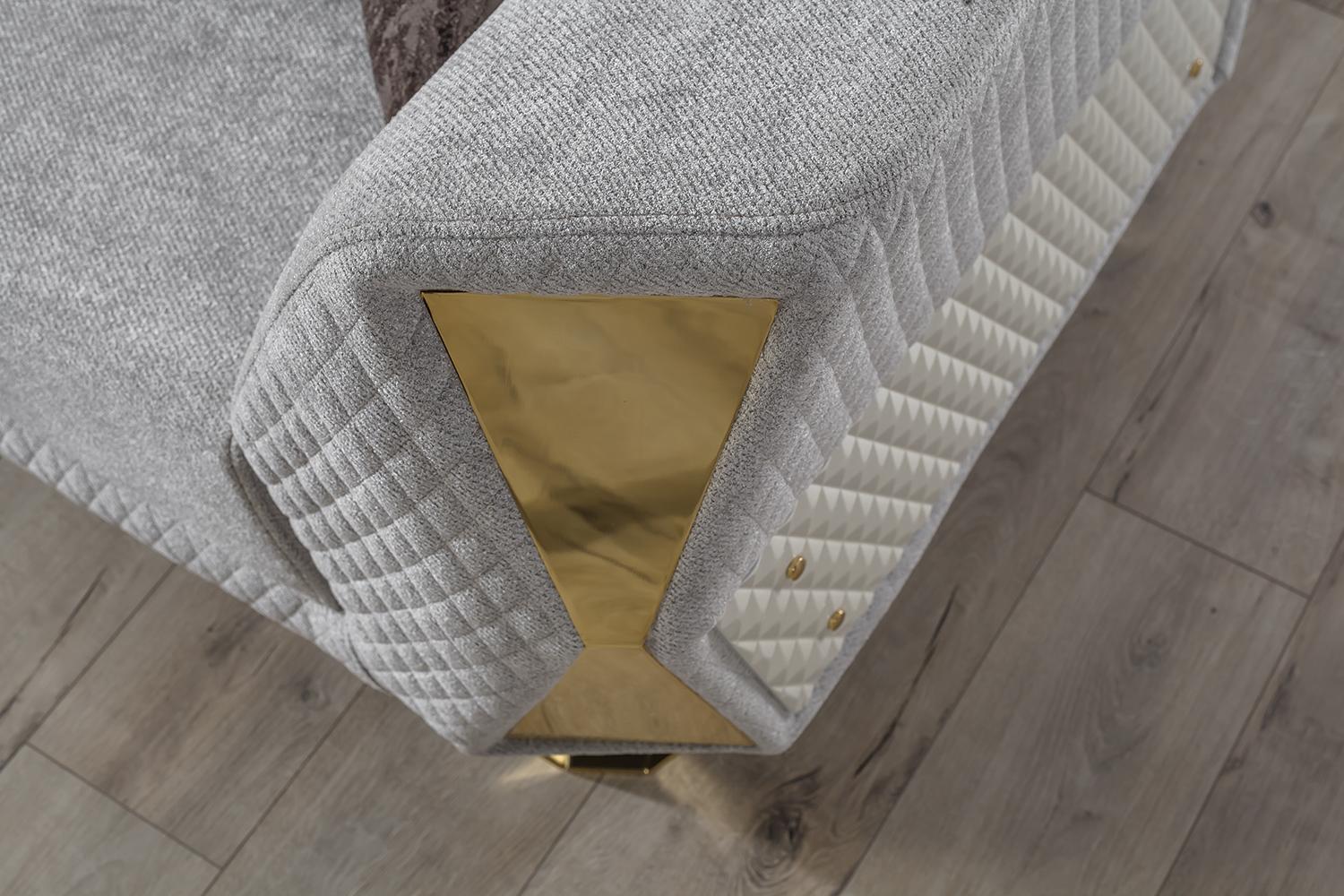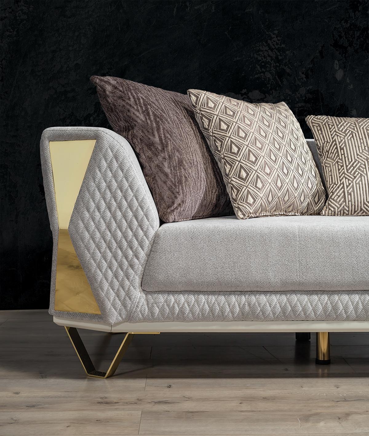 Šis trīs vietu dīvāns ir pieejams kā attēlā redzamajā krāsā, bet iespējamas arī citas krāsas pēc pieprasījuma. Tas izgatavots no metāla ar tekstila pārklājumu, nodrošinot gan ilgmūžību, gan stilīgu izskatu. Izmanto šo dīvānu, lai radītu komfortablu un mājīgu atmosfēru savā dzīvojamajā istabā vai iekārtojot viesistabu, kur viesi var atpūsties un justies ērti.