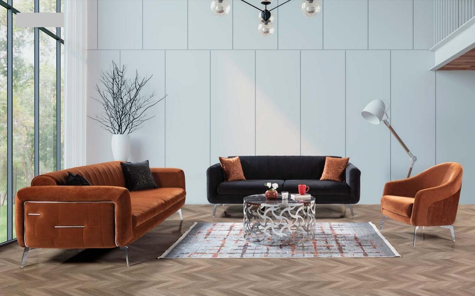Oranžais dizaina dīvāns ar samta pārklājumu ir kvalitatīva un eleganta mēbele, kas iederēsies jebkurā mūsdienīgā interjerā. Šis dīvāns ir trīs vietu, nodrošinot pietiekami daudz vietas gan ikdienas lietošanai, gan viesu uzņemšanai. Luksusa mēbeļu audums nodrošina gan komfortu, gan ilgmūžību, savukārt samta pārklājums piešķir tam prestižu un mīkstumu.