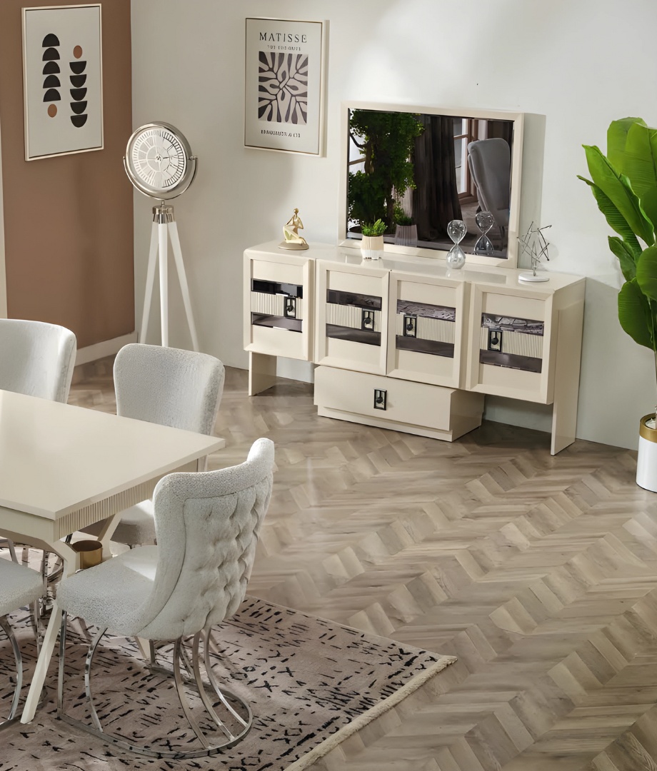 Bufete ar modernu spoguļa dizainu ir izsmalcināta mēbele, kas piešķir jūsu interjeram eleganci un modernitāti. Ar balto apdari, šī bufete ne tikai atspoguļo gaismu, bet arī rada gaisīgu atmosfēru. Tās izsmalcinātais dizains ir izstrādāts ar lielu uzmanību pret detaļām, nodrošinot ne tikai estētiku, bet arī funkcionalitāti. Ideāli piemērota ekskluzīviem mājokļiem, šī bufete ir lielisks veids, kā izcelt jūsu personīgo stilu un dzīvesveidu. Atklājiet augstākās kvalitātes meistarību, kas jau 20 gadus ir mūsu zīmola pamatā, un ļaujiet šai mēbelei kļūt par jūsu mājas greznības simbolu.