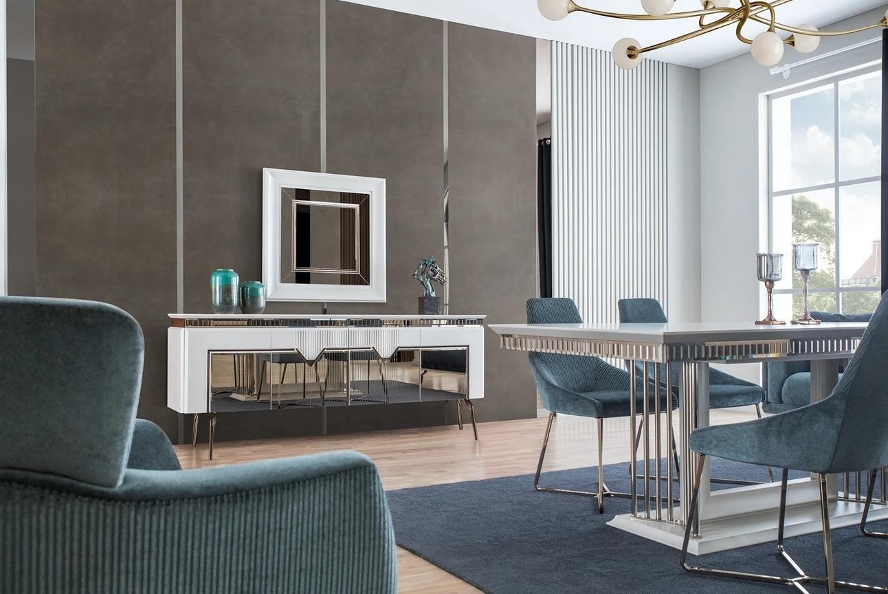 Dizainera ēdamistabas komplekts sastāv no 2 daļām. galds ar atvilktni, spogulis un komoda sudraba krāsā.