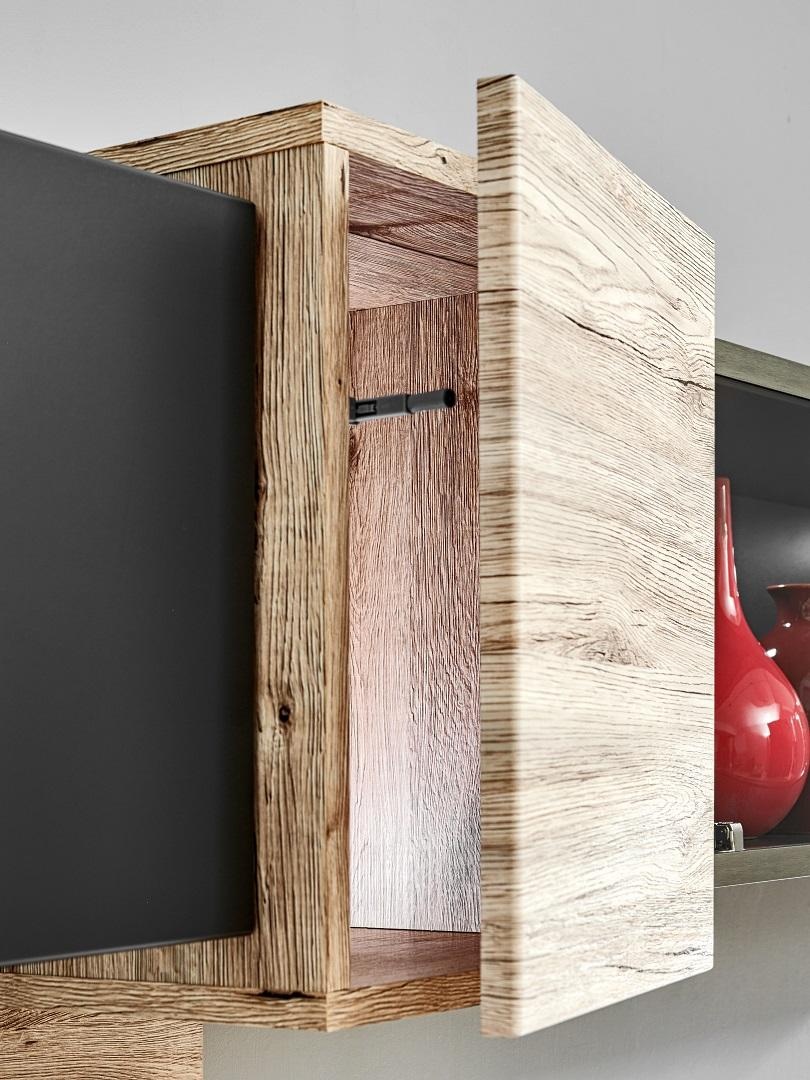 Moderns sienas ansamblis viesistabai ar pelēkiem plauktiem un televizora statīvu | xlmebeles.lv