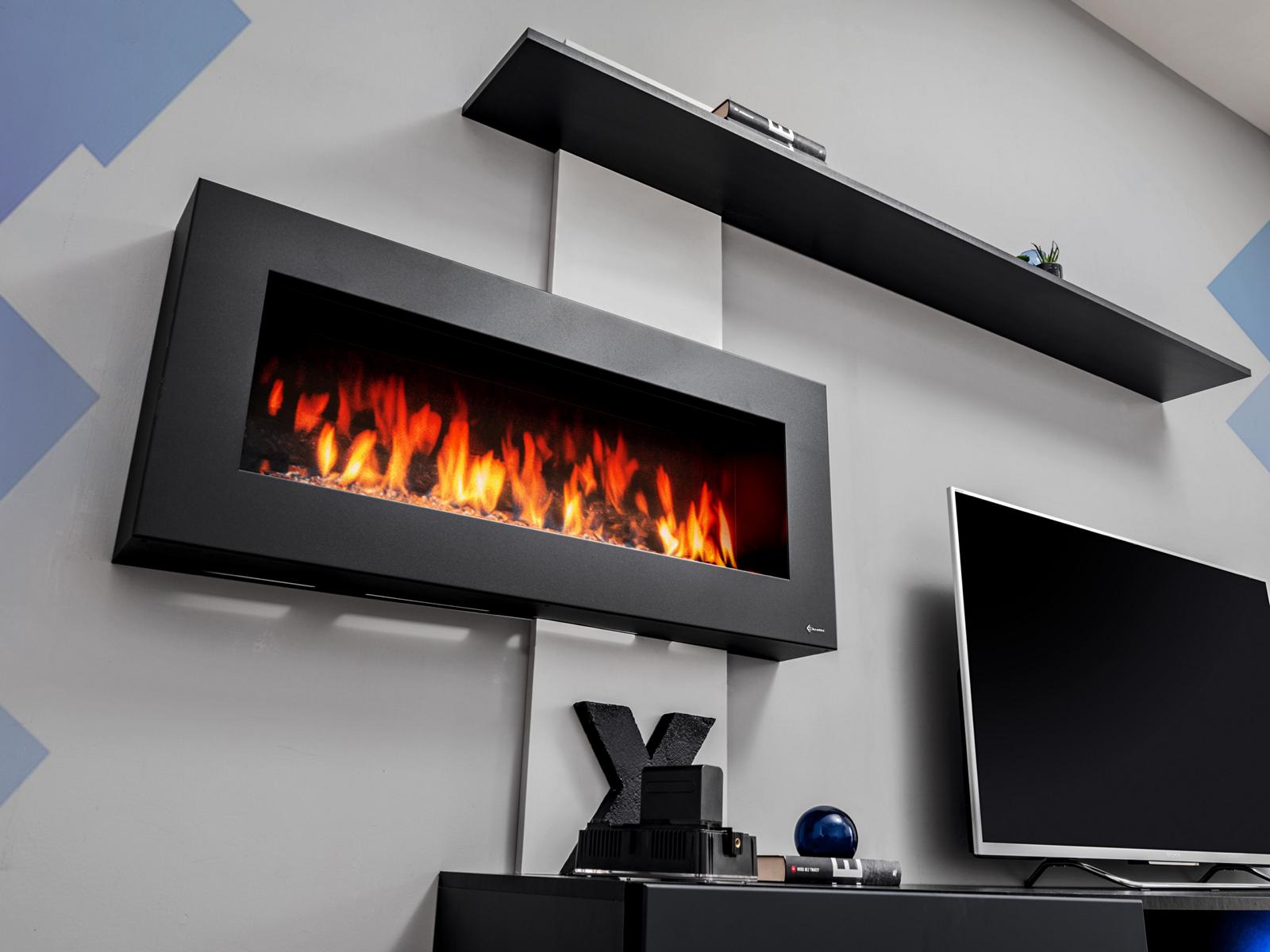 Melna dzīvojamā siena ar kamīnu, dzīvojamā istaba dizainera moderniem mēbelēm un TV statīvu.