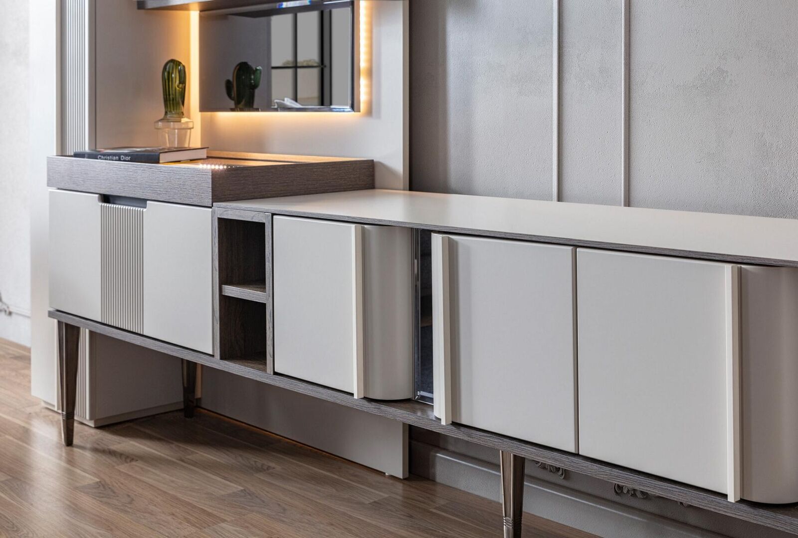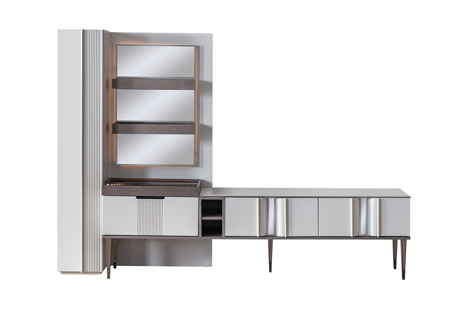 Izklaidojoša sienas vienība, balta krāsa, dizaina mēbeles dzīvojamajai istabai ar LED apgaismojumu.
