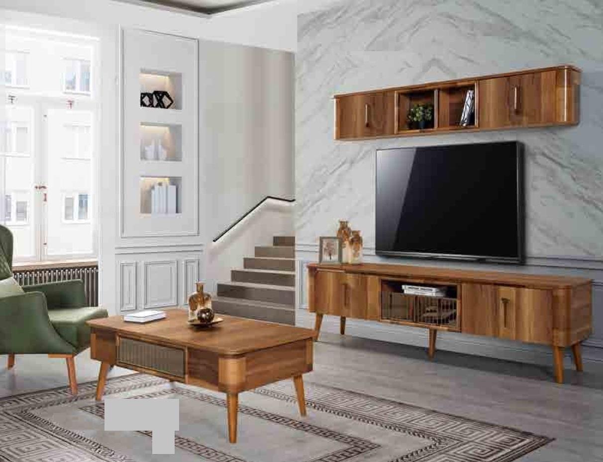 Šis RTV televīzijas komplekts piedāvā elegantu un modernu dizainu, kas iederēsies jebkurā mūsdienīgā mājas interjerā. Komplektā ietilpst sānu skapītis un divi koka galdi, kas palīdzēs radīt harmonisku un funkcionālu telpas ietērpu. Sānu skapītis ar izsmalcinātu ādas apdares pieskārienu nodrošina gan stilu, gan izturību. Ar televīzijas skapīša zemu dizainu un modernajiem elementiem, komplekts radīs jauku vienotu izskatu mājas viesistabā vai izklaides telpā.