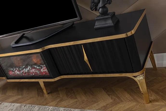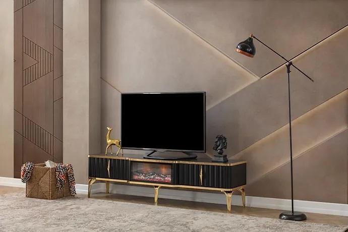 Melna TV skapis, imitēts kamīns, dzīvojamā istabas mēbeles