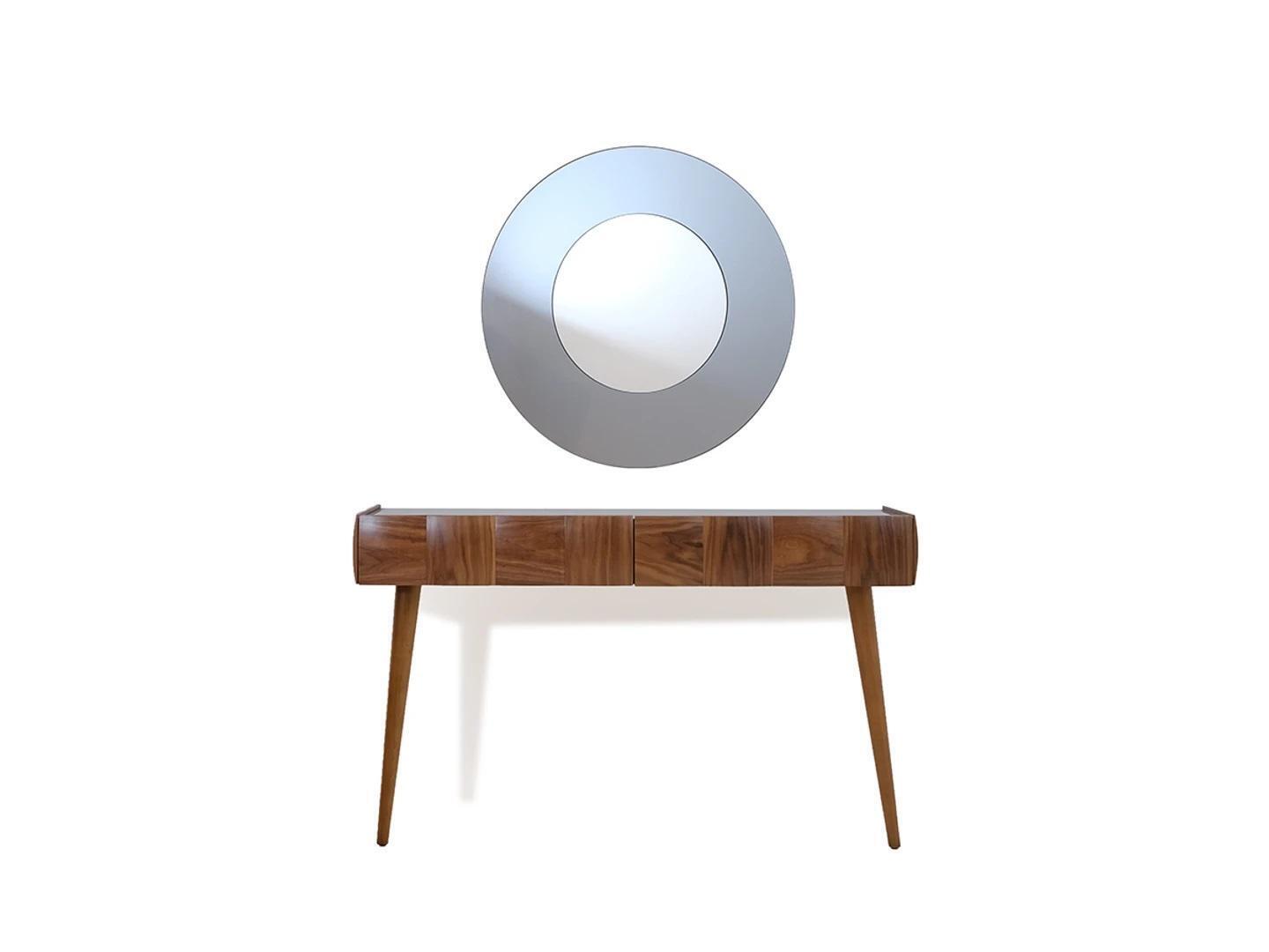 Konsolnijs ar spoguli Moderns dzīvojamais istabas luksusa mēbeļu komplekts Konsole ir stilīgs un funkcionalitāti pilns mēbeļu komplekts tavai dzīvojamai istabai. Šis konsoles galds ar spoguli ir izgatavots no augstas kvalitātes koka un ir apmēram 151 x 47 x 86 cm liels. Tas ir ideāli piemērots, lai papildinātu jūsu interjeru un nodrošinātu gan stilu, gan praktiskumu. Spogulis ar izmēriem apmēram 84 x 84 cm piešķirs telpai plašāku un gaismu pilnu izskatu. Krāsa atbilst attēlam, padarot to universālu dizaina elementu jebkurā dzīvojamā istabā.