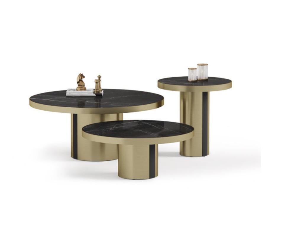 Šis Luksusa galds komplekts ir moderns un elegants papildinājums jebkurai mūsdienīgai dzīvojamai istabai. Katrs no trim galdiem ir 3 aplīšu forma, kas piešķir tiem stilīgu un izsmalcinātu izskatu. Ražots no kvalitatīva nerūsējoša tērauda ar marmora virsmu, šis komplekts ne tikai pievienos greznību jūsu telpai, bet arī nodrošinās ilgstošu izturību un vieglu tīrīšanu.