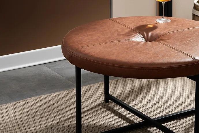 Šī mēbele ir ne tikai stilska dokle jūsu mājai, bet arī ērti izmantojama. Ar tā augstumu apmēram 45 cm un platību 80 cm, tas ir lielisks vietu saglabāšanas risinājums, piemēram, grāmatām vai tases. Brūnā āda un moderne metāla konstrukcija padara šo galdiņu par universālu gabalu, kas harmoniski iederēsies jebkurā mūsdienu dzīvojamā istabā un piešķirs tai jaunu stilu.
