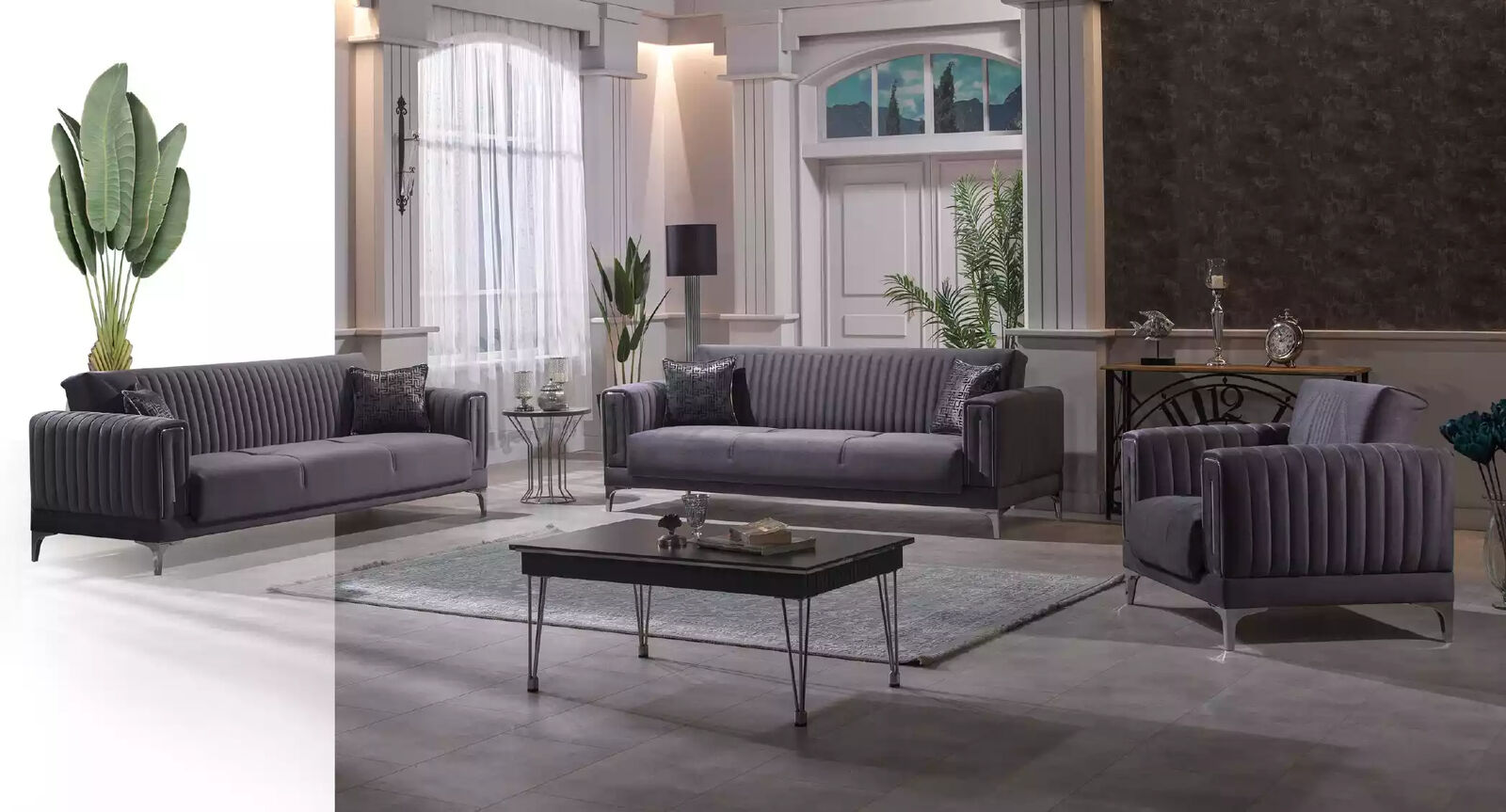 Pelēka trīsvietīga dzīvojamā istaba ar diviem mīkstiem 3-vietīgiem samta dīvāniem, koka mēbeļu dīvāns ir lielisks papildinājums jebkurai mājas interjeram. Šis elegantais dīvāns piedāvā ne tikai mājīgu un komfortablu sēdvietu, bet arī stila un elegances piesitienu telpai. Ar augstas kvalitātes koka un tekstila apvilkumu, šis dīvāns ir gan izturīgs, gan viegli kopjams. Ar saviem lielajiem izmēriem un mīkstajiem sēdekļiem, tas ir ideāls gan atpūtai, gan viesu uzņemšanai.