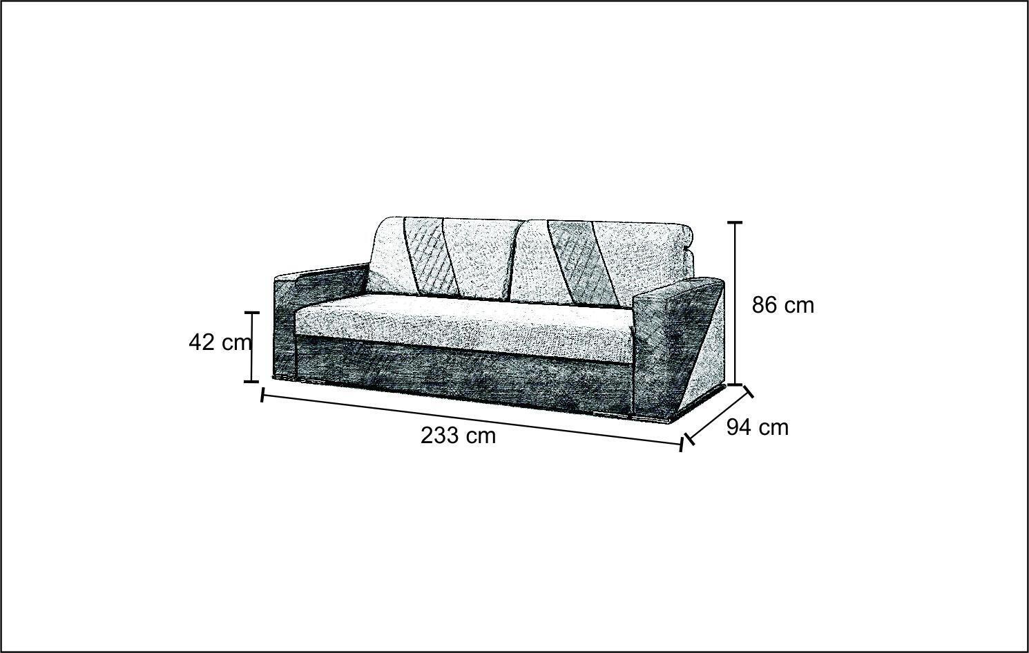 'Dīvāns 3-vietīgais dīvāns luksusa gultas dīvāns dīvāns liels piederumi dizains mēbeles trīsvietīgs jauns' ir īsta luksusa un dizaina līmenī radīts mēbelu gabals, kas ne tikai piešķirs jūsu telpai eleganci, bet arī nodrošinās komfortu un funkcionalitāti. Šis 3-vietīgais dīvāns ir pārdomāts līdz pat mazākajai detaļai, ar iekšējo rāmi no īsta koka, kas garantē izturību un stabilitāti. Ar guļamzonas izmēriem apmēram 147 x 197 cm un sēdēšanas platuma izmēriem apmēram 233 x 94 x 86 cm, šis dīvāns ir gan plašs, gan ērts, ļaujot baudīt relaksējošus brīžus mājās. Materiāls - augstas kvalitātes tekstils, kas nodrošina gan maigumu, gan ilgmūžību.
