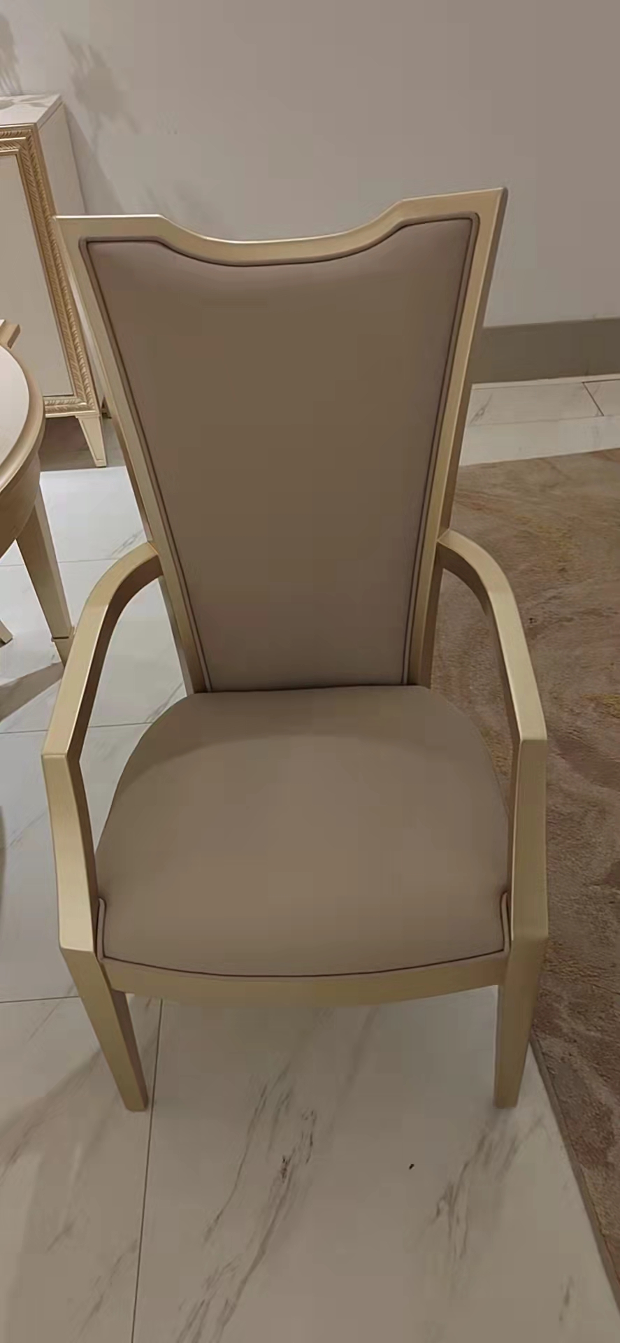 Luksusa krēsls koka mēbeles viesnīca krēsls krēsli jauns ēdamistaba ir izsmalcināts un elegants krēsls, kas piemērots gan viesnīcām, gan mājas interjeram. Ar krēsla roku balstiem un stabilo konstrukciju, tas nodrošina ērtību un atpūtu ilgstošām sēdēšanas sesijām. Ar izmēriem apmēram 56 x 70 x 105 cm, tas ir piemērots gan sēdēšanai ēdamistabā, gan viesnīcas numurā vai publiskās telpās.