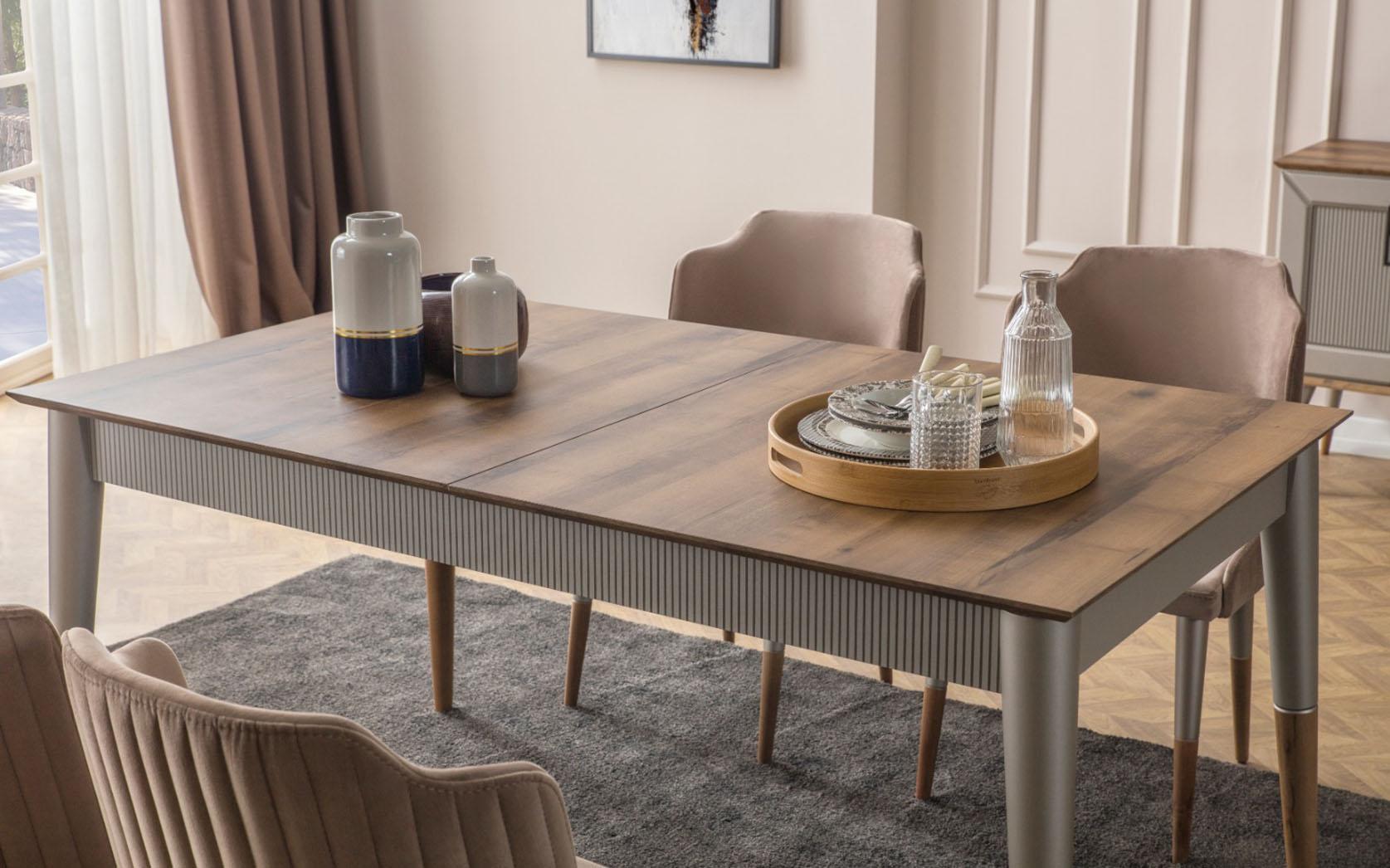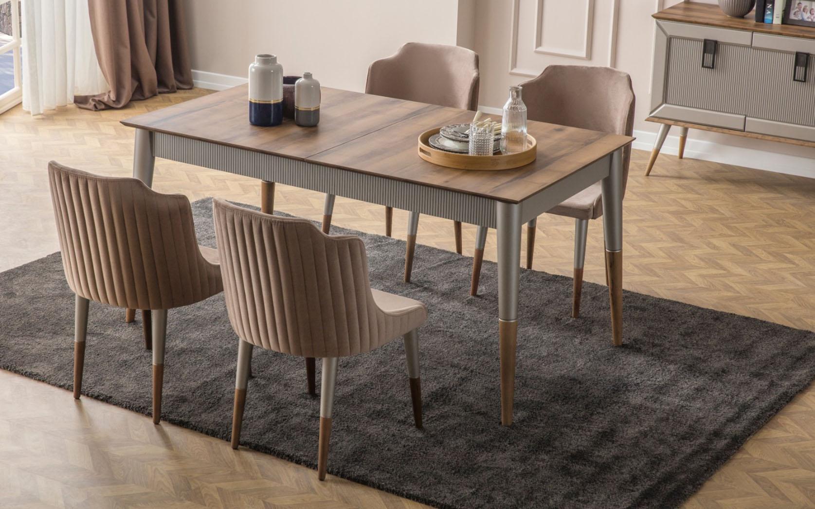 Helle ēdamistabas komplekts Izturīgs ēdamgalds Luksusa galds 9 gab. piedāvā Jums stilīgu un izturīgu ēdamistabas komplektu, kas iederēsies lieliski gan modernā, gan klasiskā interjera iekārtojumā. Šis komplekts ietver izturīgu ēdamgaldu ar izvelkamo funkciju un 6 komfortablus krēslus, kas nodrošinās ērtu un stilīgu sēdēšanu. Mēbeles ir izgatavotas no kvalitatīva koka un auduma, nodrošinot gan izturību, gan eleganci Jūsu telpās.