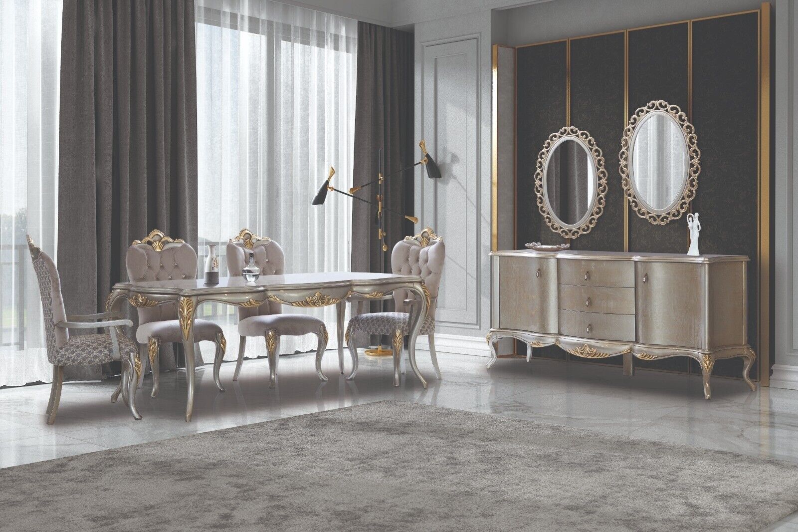Pilna ēdamgalds, pusgalds, ēdamistaba, ēdamgalds, koka komplekts 12 gab. Bežā krāsa ir izsmalcināta un funkcionala ēdamistabas komplekta izvēle jūsu mājai. Šis komplekts ietver plašu ēdamgaldu, krēslus un bufeti ar spoguli, nodrošinot jums pilnvērtīgu mēbeļu komplektu ēdamistabai. Ēdamgalds ir izgatavots no koka un auduma materiāliem, nodrošinot gan izturību, gan stilu savā interjerā. Ar tām aprīkoti arī 12 eleganti dizainēti krēsli, kas padarīs jūsu maltīšu laiku vēl patīkamāku un komfortablāku.