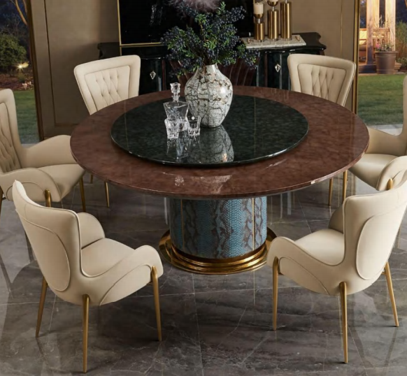 Šis ēdamistabas komplekts pieejams klasiskā krāsā, kas saskanēs ar jebkuru interjeru, bet pēc pieprasījuma ir iespējamas arī citas krāsas. Materiāli - koks, nerūsējošais tērauds un āda, nodrošina izturību un ilgmūžību. Komplektā iekļauta arī īstā koka iekšējā konstrukcija, kas garantē stabilu un izturīgu dizainu. Šis komplekts papildinās jebkuru ēdamistabas telpu ar stilu un funkcionalitāti, būdams ideāls variants gan ikdienas maltīšu baudīšanai, gan viesu sagaidīšanai.