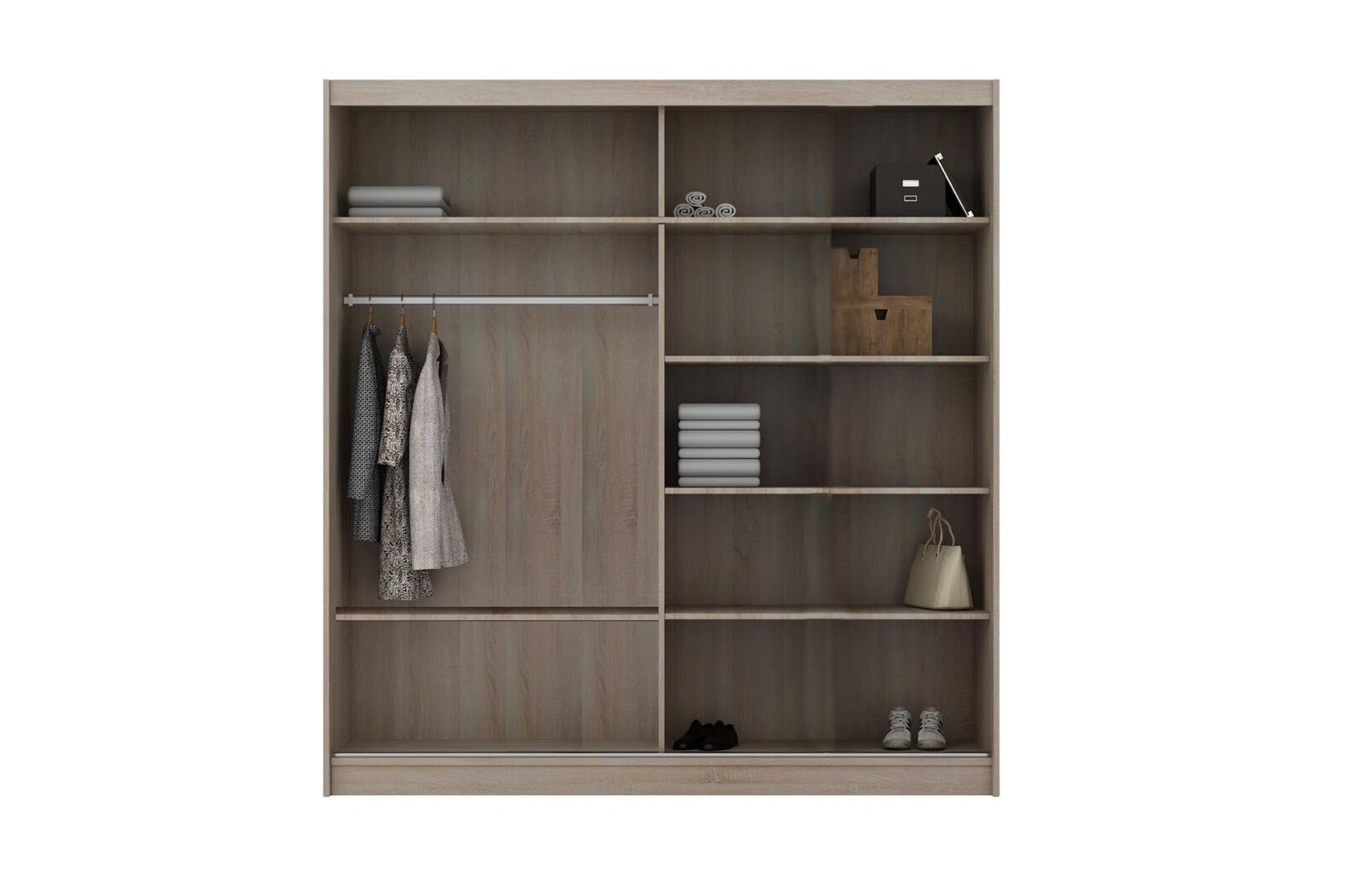 Šis Drēbju skapis ir ne tikai praktisks, bet arī elegants papildinājums jūsu guļamistabai. Ar tā apmēriem apmēram 200 x 60 x 216 cm, tam ir pietiekami daudz vietas, lai glabātu visus jūsu apģērbu un aksesuārus organizēti un viegli pieejami. Skapja slīdošie durvis nodrošina gludu darbību un ietaupa telpu, maksimāli izmantojot jūsu guļamistabas telpas.