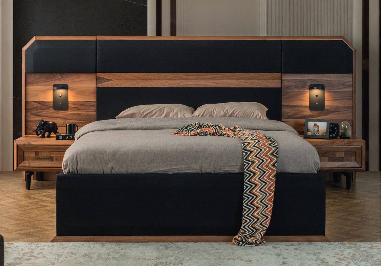 Brūnā-melna koka guļamistabas komplekts ar divguļamā gultu, 2 naktsgalda komplektu 3 gabalos.