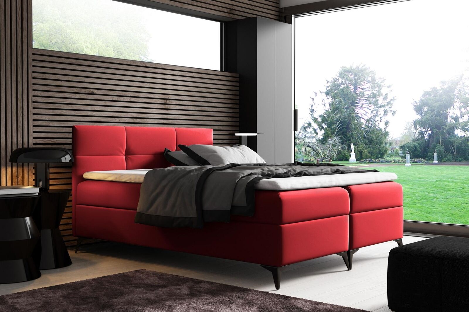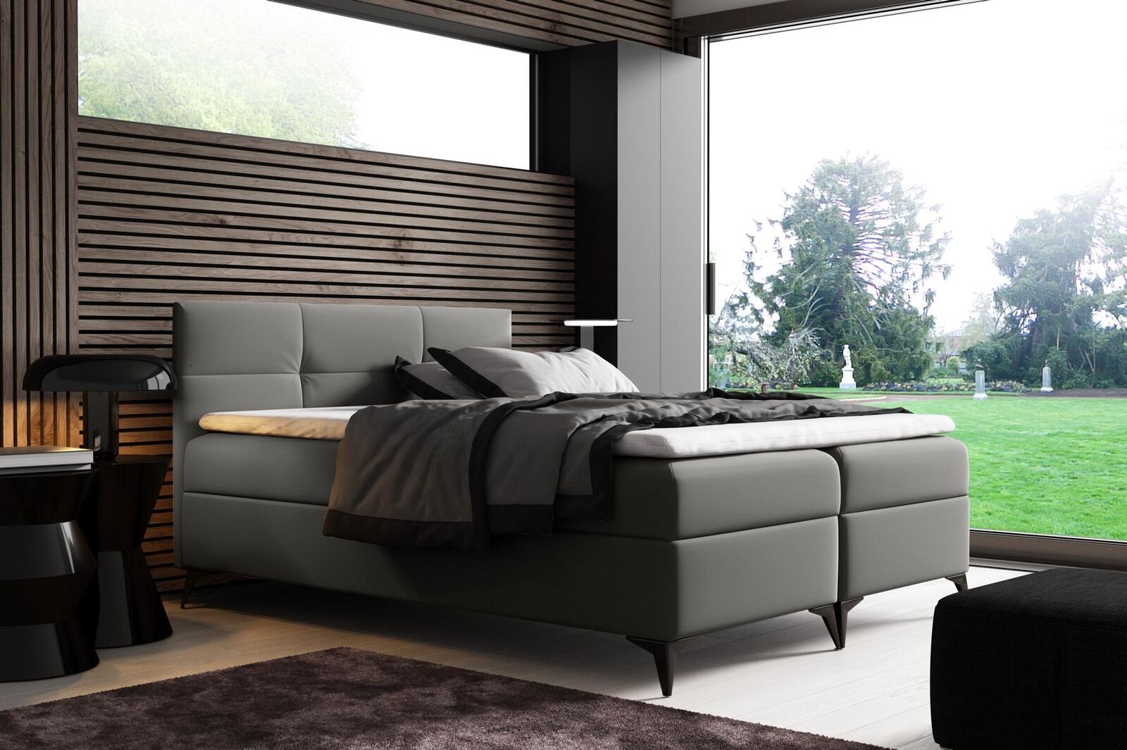 Gulta ar gultas kasti 180x200 Boxspring gulta Dizaina Dubultgulta Viesnīcai Moderns Gultas Jaunas ir moderna un elegantā dizaina Dubultgulta, kas piemērota gan viesnīcām, gan privātmājām. Šī gulta izceļas ar savu augsto kvalitāti un ērtumu, nodrošinot ideālu atpūtu un labu miegu saviem lietotājiem. Ar platību apm. 180 x 200 cm un gultas kastes funkcionalitāti, tajā tiek nodrošināts pietiekami daudz vietas, lai glabātu ikdienas priekšmetus. Matrača no Bonell atsperēm un augstfleksošs putu materiāls T30 garantē maksimālu komfortu un atpūtu nakts laikā.