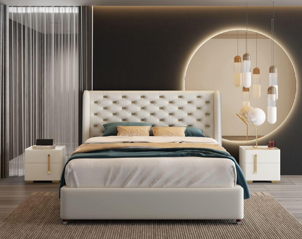 Guļamistabas mēbeļu dizainera gulta piedāvā eleganci un funkcionalitāti, apvienojot kvalitatīvu koka gultas karkasu ar stilīgu dizainu. Ar izmēriem apmēram 240 x 232 x 115 cm, šī gulta ir piemērota lielam guļamistabas telpu. Guļamā vieta 180x200cm nodrošina komfortablu miegu, savukārt kvalitatīvais materiāls - koks un mākslīgā āda - garantē ilgmūžību un vieglu kopšanu. Krāsas tonis atbilst attēlam, piešķirot interjeram eleganci un siltumu.