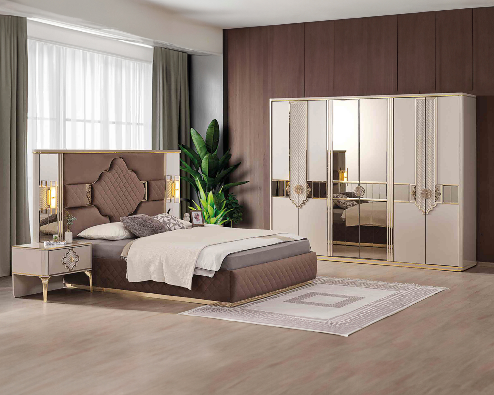 Brūna-beža ekskluzīva guļamistabas komplekta divguļamā gulta ar diviem nakts plauktiem ir ideāla izvēle tiem, kuri vēlas savai guļamistabai piešķirt greznīgu un mierīgu atmosfēru. Lieliski iekļaujoties mūsdienu interjerā, šis komplekts ir ne tikai vizuāli pievilcīgs, bet arī ļoti funkcionāls. Izmantojot papildu krāsu iespējas un pielāgojot komplektu saskaņā ar savām vēlmēm, jūs varat radīt personīgu un mājīgu guļamistabu, kas atspoguļo jūsu individuālo stilu un gaumi.