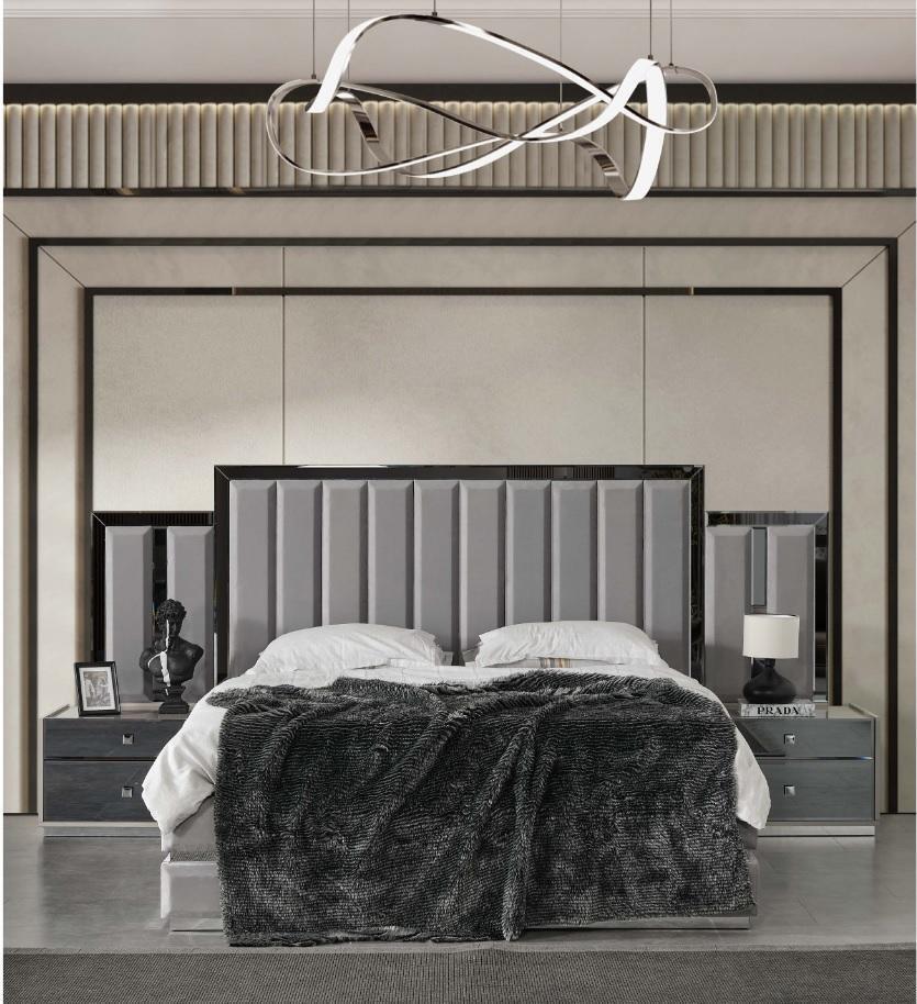 Gultas istaba komplekts ar divvietīgu gultu, diviem nakts galdiņiem un skapi 3 gabalos pelēkas krāsā.