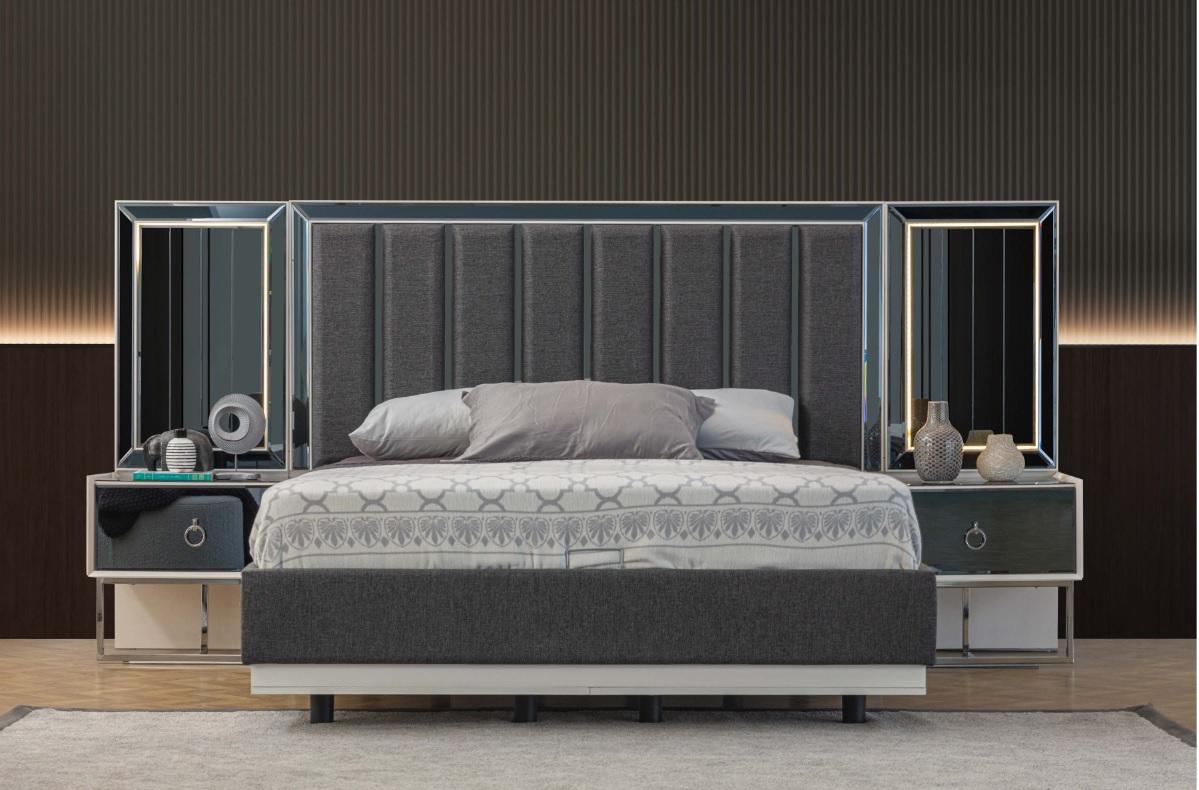 Pelēkas guļamistabas komplektācija ar nerūsējošā tērauda gultu, 2 koka nakts skapīši 3 gab. komplekts