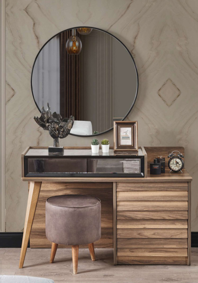 Brunšainais koka grima galds ar apaļo spoguli, dizainera guļamistabas 2 gab. komplekts.