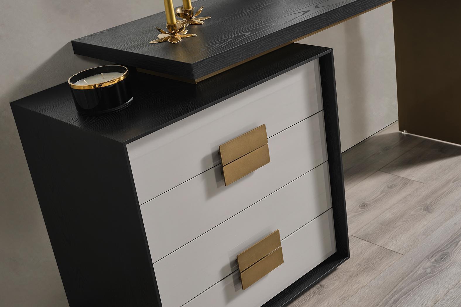 Šis ekskluzīvais komplekts ne tikai būs lielisks papildinājums jūsu guļamistabai, bet arī ļaus jums iegūt gatavošanās rituālam pareizo atmosfēru. Jūs varēsiet izbaudīt katru kosmētikas līdzekli, ieturot vietu sakārtotu un tīru. Spogulis ne tikai papildinās komplekta dizainu, bet arī atspoguļos jūsu stilu un rotaslietas, radot spilgtu un greznu telpu. Izcilās kvalitātes materiāli, kāds ir dabīgs koks un stikls, nodrošinās ilgmūžīgu izmantošanu un stabilitāti, tādējādi radot ietekmīgu ainavu jūsu guļamistabā.