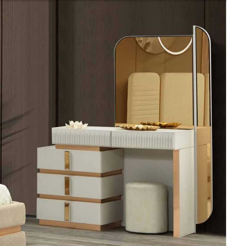 Šis mūsdienīgais beige grima galds ar spoguli ir perfekta izvēle tiem, kas vēlas piešķirt savai telpai eleganci un stilu. Ar augstumu 180 cm šis galds ne tikai ir funkcionalas mēbeles, bet arī pievieno telpai garšu un lielisku dizainu. Tā kvalitatīvais dizains un augstvērtīgais materiāls no koka un stikla nodrošina ilgstošu izturību un estētisku izskatu. Šis grims galds papildinās jebkuru iekštelpu un radīs tajā mājīgu atmosfēru, kurā jūs varēsiet komfortabli un stilīgi veikt savu ikdienas rituālus.
