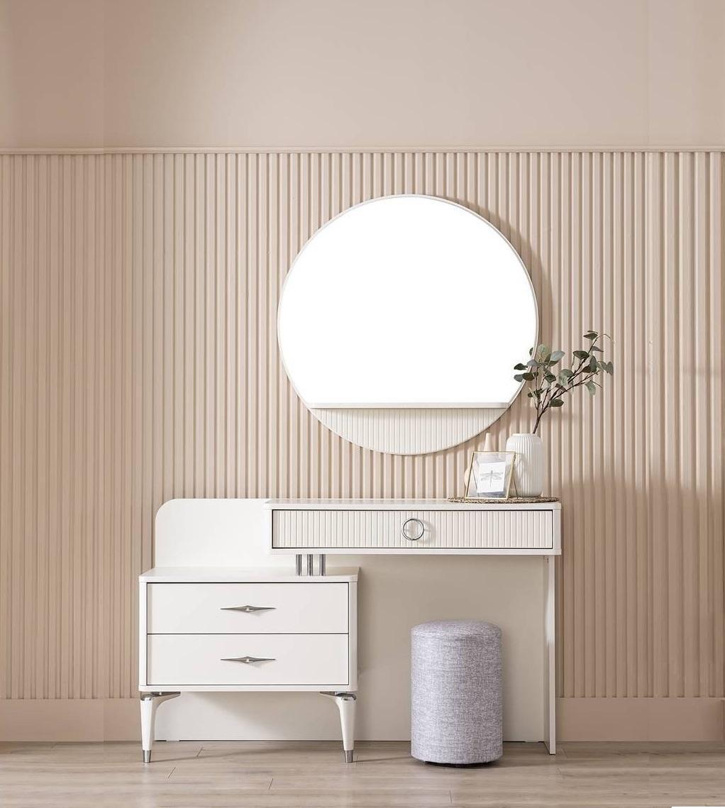 Šis mūsdienīgais konsoles galds ir ideāls papildinājums jūsu mājas iekārtojumam. Komplektā ietilpst 3 gabali - galda komoda, spogulis un krēsls, kas veido elegantu un funkcionālu dizainu. Mēbeles ir balta krāsā, kas piešķir telpai vieglumu un eleganci. Galda komode ir lieliska glabāšanas vieta un tajā ir plašas nodalījumi dažādu mantu un lietām. Spogulis ar tā lielo platumu un augstumu dod iespēju rūpīgi sakārtot savu tērpu vai kosmētikas līdzekļus. Krēsla ergonomiskais dizains nodrošina ērtu un atpūtošu sēdēšanu.