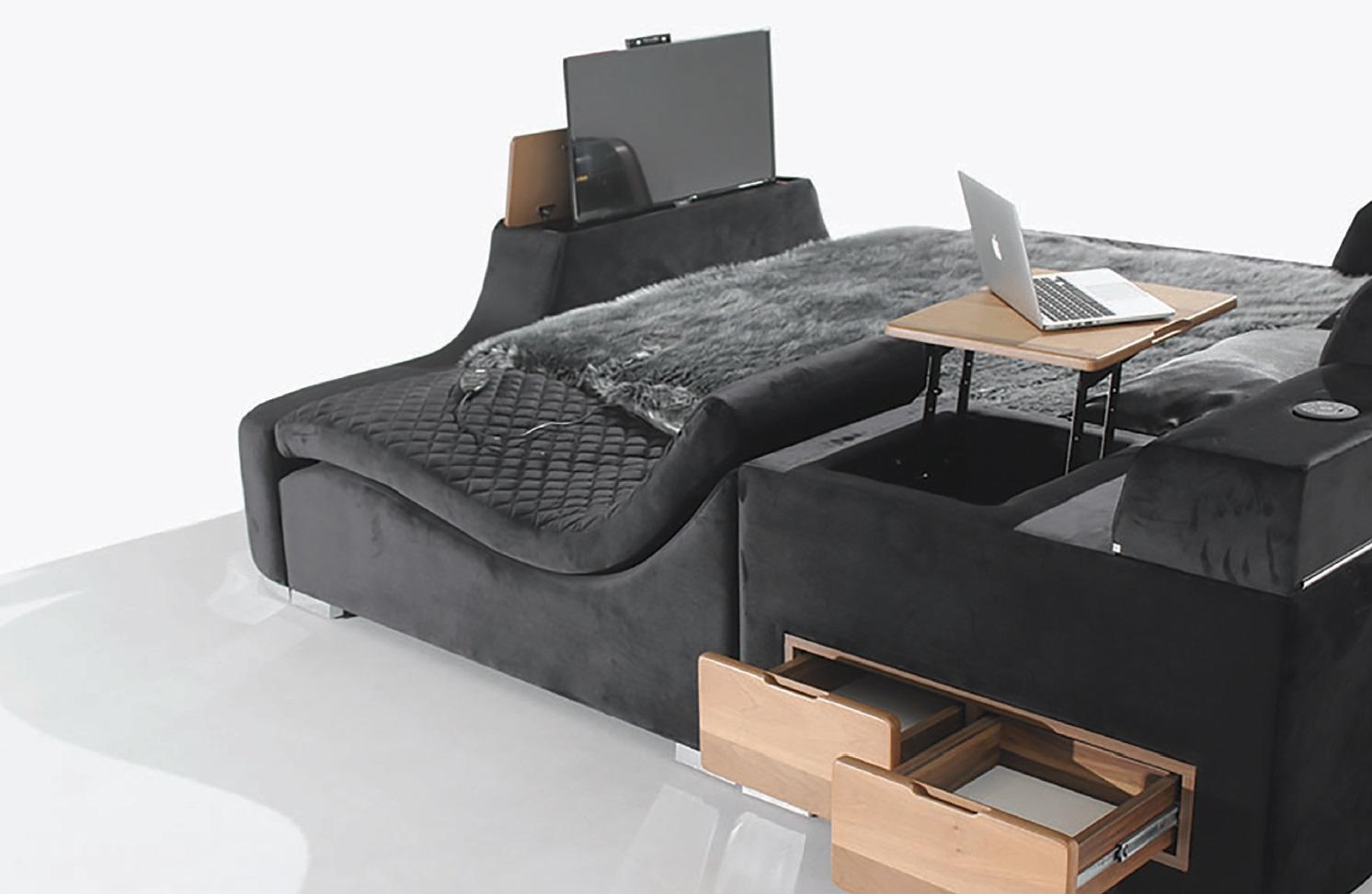 Gulta ar TV pacēlāju televizoru Multifunkcionālie gultas divguļamā gulta guļamistabā.